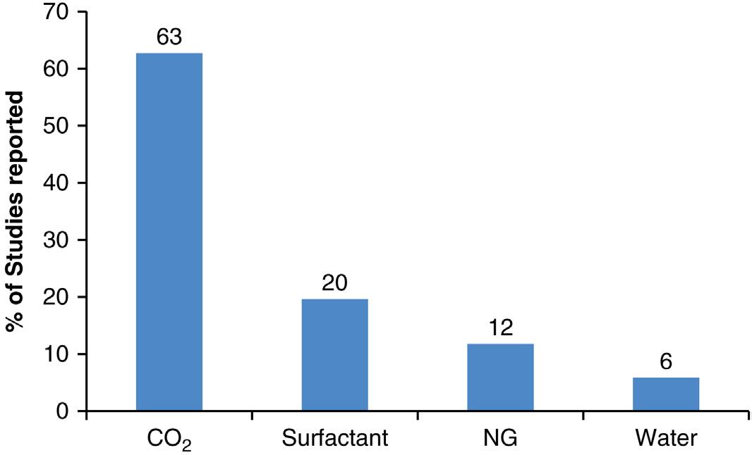 According to an extensive review by Alfarge et al. (2017), CO2, natural gas, surfactant, and water are the most applicable IOR methods for unconventional reservoirs, as shown in Fig. 1.6. The most common mechanisms being reported for these IOR methods are listed in Table 1.2. CO2 injection tops the list of these applicable EOR methods according to simulation studies and experimental work. However, natural gases performed better than CO2 in pilot tests (Hoffman & Evans, 2016; Schmidt & Sekar, 2014), indicating that there is something missing which creates this gap between lab work and pilot tests for the CO2 injection technique. Specifically, insufficient understanding of the physical and chemical mechanisms for CO2 might be the main reason for such disappointing results from CO2 pilot tests.