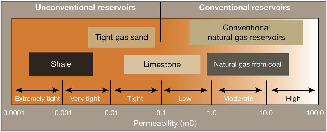 The permeability is usually more than 0.1 millidarcies, as shown in Fig. 1.4. However, in unconventional reservoirs, porosity is commonly