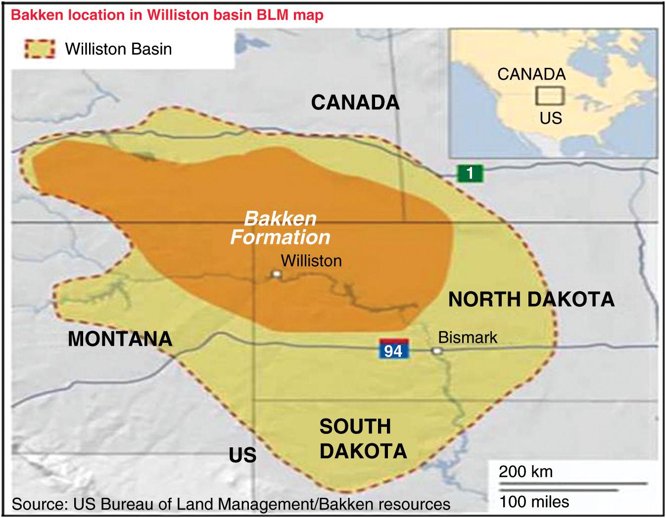 In conventional reservoirs, hydrocarbons migrate (usually upward) to the reservoir rocks until they become trapped against an impermeable rock called the cap rock. This process of migration leads to having conventional reservoirs in localized pools (discrete reservoirs). However, unconventional reservoirs are often found within the same source rocks and distributed over extensive continuous areas rather than concentrated in localized places. For example, the Bakken play extends from the northern area of the United States to the southern part of Canada, covering hundreds of thousands of square miles, as shown in Fig. 1.5. Chapter 2 of this book provides more