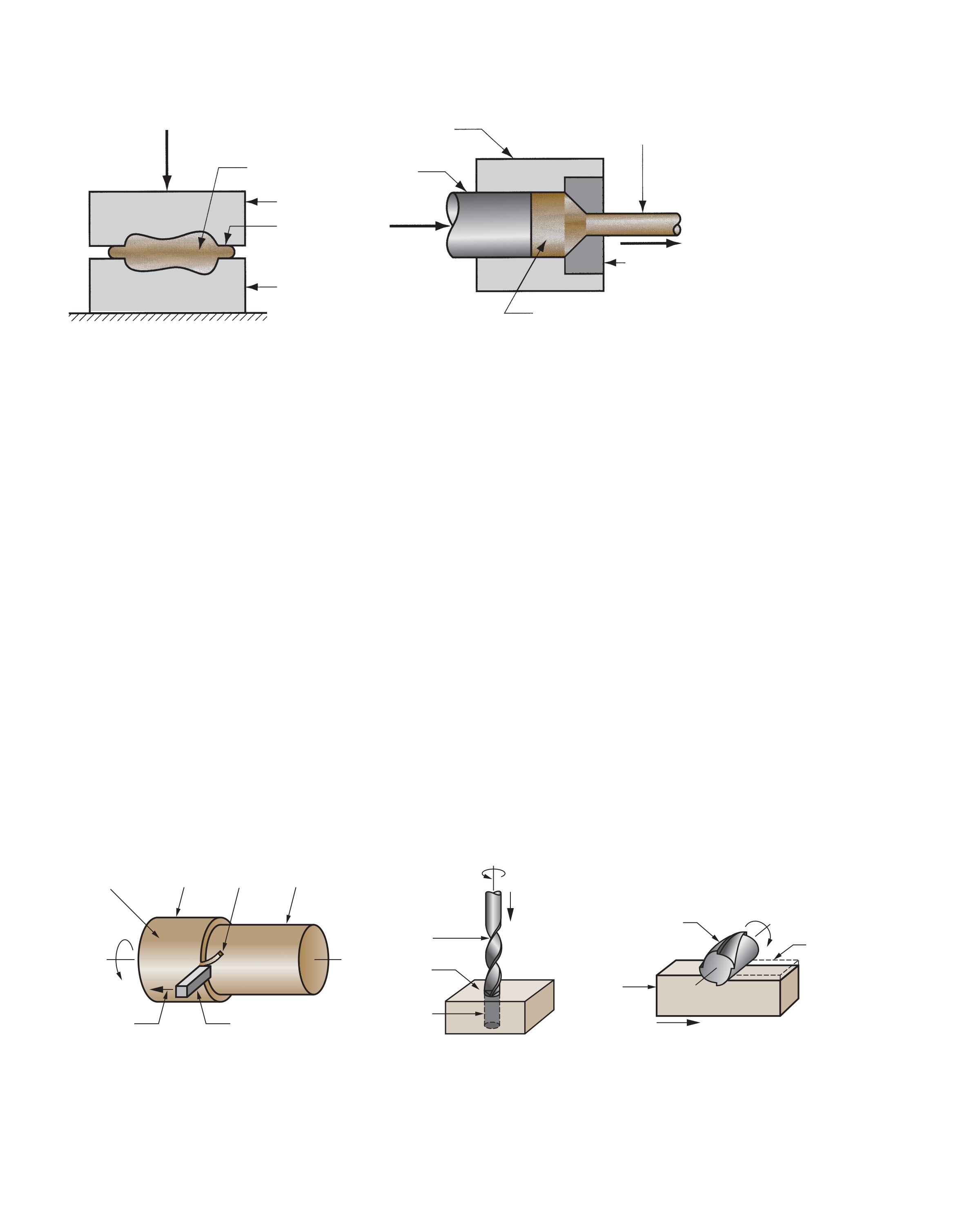 In the deformation processes, the starting work part is shaped by the application of forces that exceed the yield strength of the material. For the material to be formed in this way, it must be sufficiently ductile to avoid fracture during deformation. To increase ductility (and for other reasons), the work material is often heated before forming to a temperature below the melting point. Deformation processes are associated most closely with metalworking and include operations such as forging and extrusion, shown in Figure 1.8. Figure 18.18 shows a forging operation performed by a drop hammer.