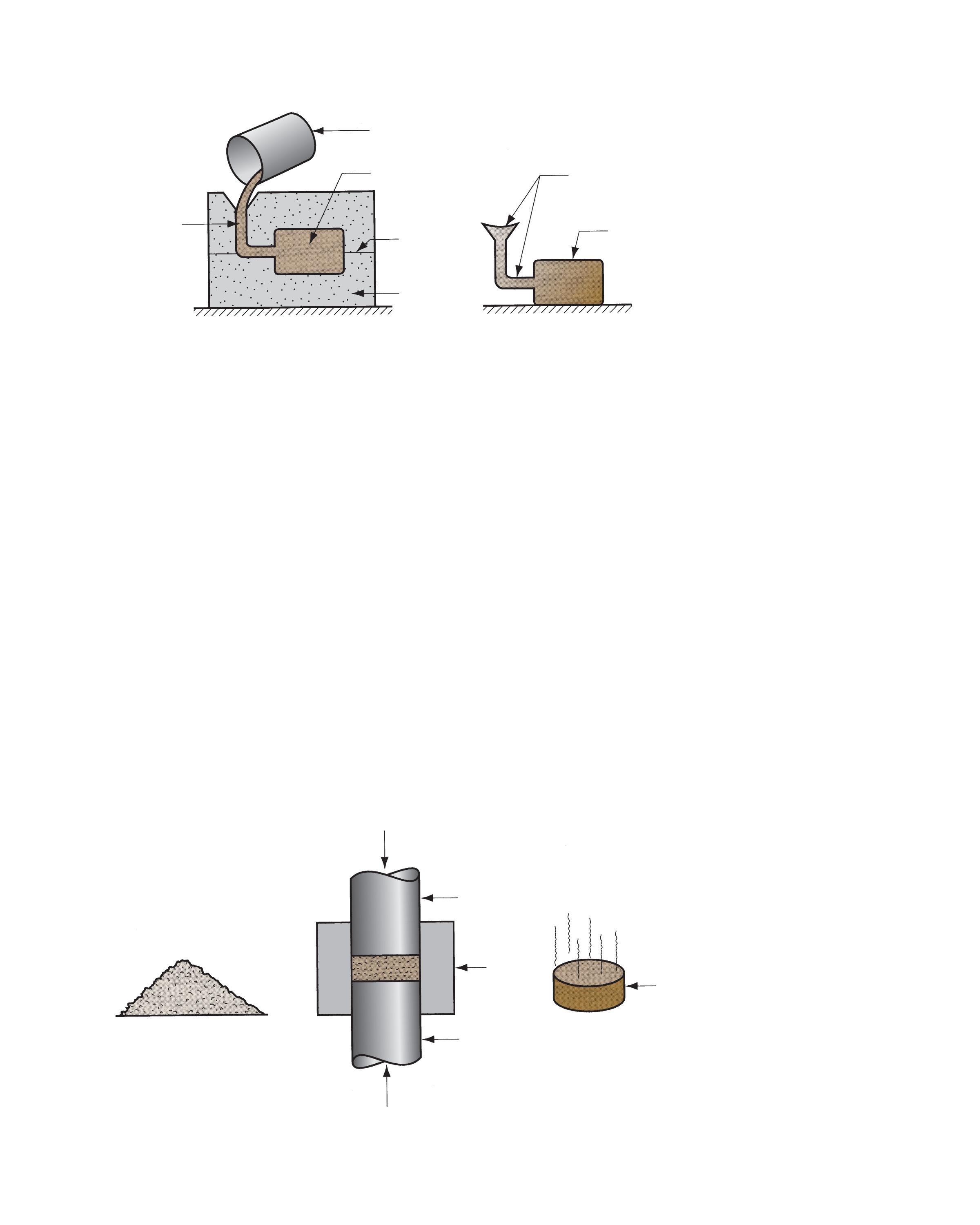 glasses, and plastics can all be heated to sufficiently high temperatures to convert them into liquids. With the material in a liquid or semifluid form, it can be poured or otherwise forced to flow into a mold cavity and allowed to solidify, thus taking a solid shape that is the same as the cavity. Most processes that operate this way are called casting or molding. Casting is the name used for metals, and molding is the common term used for plastics. This category of shaping process is depicted in Figure 1.6. Figure 11.6 shows a cast aluminum engine head, and a collection of plastic molded parts is displayed in Figure 13.20.