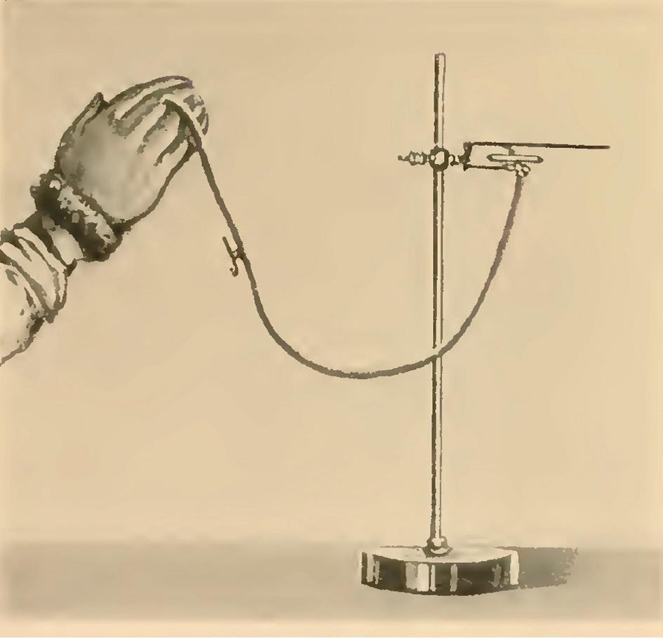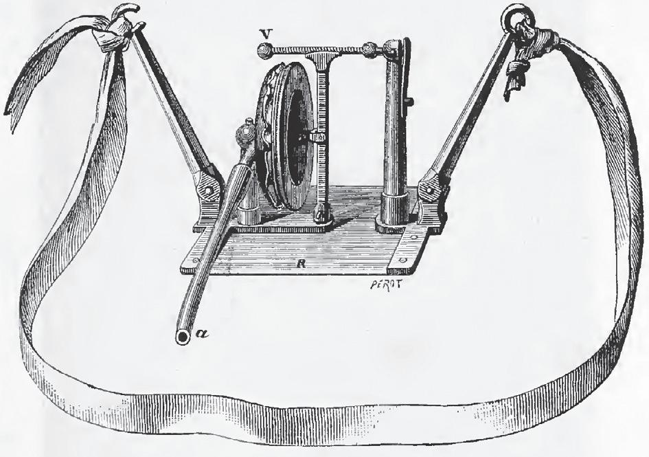 The movement of the chest that accompanies ventilation was investigated first by medical scientists who devised their own instrumentation. One of the earliest among them was Étienne-Jules Marey, a French physiologist in the 1800s. His was a device that used levers and tambours, and was held in place with a strip of silk (Figure 1.6). The device, though serviceable, was replaced by a newer design (Figure 1.7) that was similar to the one found on most modern polygraphs. It had a metal spring encased in rubber tubing, connected to a small rubber hose leading to the recording device. It was held in place around the torso with a small chain. Originally dubbed the Fitz pneumograph (Fitz, 1896), it was also called the Harvard or the Sumner pneumograph (Whitney, 1911).