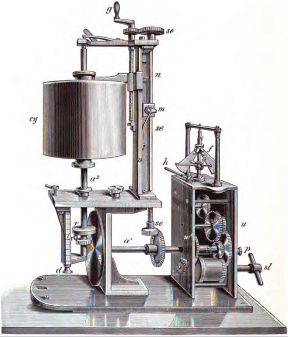 Ludwig’s final design allowed different recording speeds, horizontal or vertical orientation of the drum, and either clockwise or counterclockwise rotation of the drum.