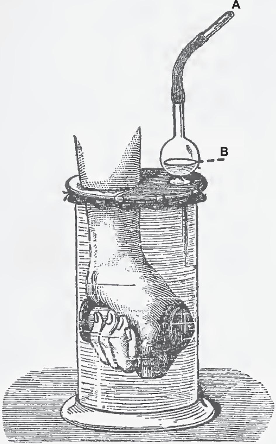 The first phenomenon to find application in deception tests was the change in relative blood volume which accompanies certain emotional states. The Italian criminologist Cesare Lombroso (Lombroso Ferrero, 1911) had observed in the 1880s, along with other researchers, that deception was often detectible by such physiological responses as blushing, perspiring, and changes in respiration. Lombroso used two types of devices in an attempt to detect the act of lying, the hydrosphygmograph and the volumetric glove (Figure 1.3). Changes in pressure were brought about by variations in blood volume in the subject’s hand, an imprecise but serviceable method of