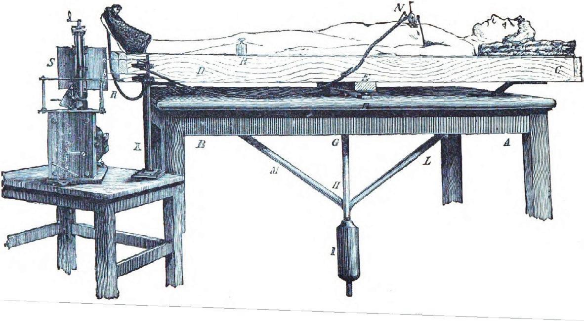 Mosso’s (1886) “berceau scientifique” or scientific cradle. Mosso used this device in his studies of fear. Note the kymographion on the left and a Marey pneumograph (Figure 1.6) on the subject’s chest. The counterweight is depicted to the side of the subject’s left knee.