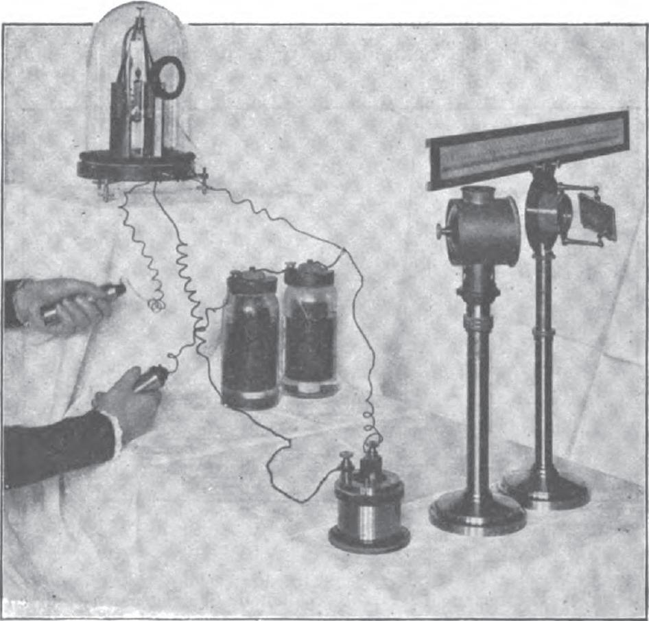 Binswanger also cited the work of Otto Veraguth (1909)5 who used the electrodermal response in his work with word associations. Veraguth’s apparatus was the Deprez-d’Arsonval “deadbeat reflecting galvanometer” (Figure 1.8). Veraguth observed that salient words evoked larger phasic electrodermal responses than did neutral words. He also was the first to make note of the effect of habituation in the electrodermal data, wherein the first neutral words were evoking larger responses than subsequent neutral words. Veraguth did not investigate the use of the electrodermal