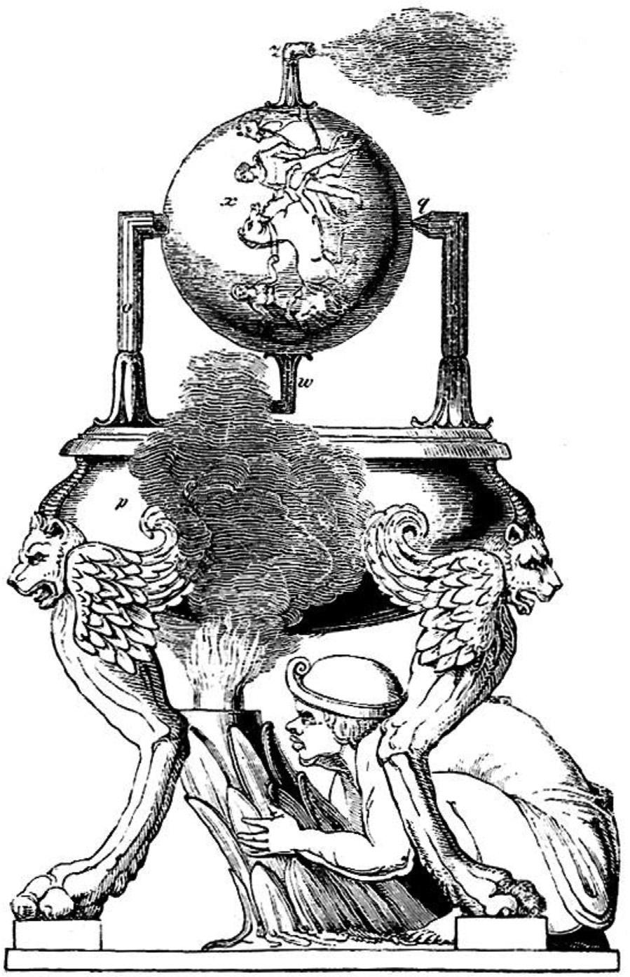 Itwassaidin Section1.2 thatahumanbeingneverusedfiretogetpowerbefore the18thcentury.However,thereisonerecordleftbyHeroninAlexandriaaround 150BCEassketchedin Fig.1.6[3].Hegeneratedsteambyheatingwaterusing fire.Thesteamwasblownoutfromnozzlesthatwereattachedtoaspheretangentially,andthenthesphererotated.Itwasreallytheboilerandreactionturbine systemitself.However,thereisnorecordofhowthesystemwasused.Sincethen untilthe18thcentury,ahumanbeingneverusedfiretogetpowerinreality althoughseveralideashadbeenproposed.