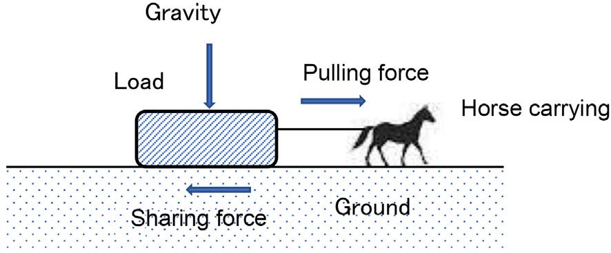 Letusconsiderthesituationasshownin Fig.1.2.Someloadisontheground. Thegravityforceisactingontheload.Thebodydoesnotmove,thusnoworkis donephysically.Iftheloadisconnectedtoahorsewitharopeandthehorsepulls theropeasshownin Fig.1.3,theloadiscarriedbythehorse.Sharingforcecomes outbetweenthebottomoftheloadandtheground.Thehorsepullstheloadagainst thesharinghorsewithpullingforcethatisequaltothesharingforce.Thehorseis doingworkphysicallyasaresultofthepullingforceandmoving.Thehardwork ofahumantopulltheloadonthegroundissubstitutedbytheworkofthehorse thatthehorsepullsthebodyandcarriestheload.Thus,thepowerisclosetothe workinthephysicalmeaning.Theworkinthewashingmachineisthatthemotor rotatesandstirswaterinthewashingmachine.