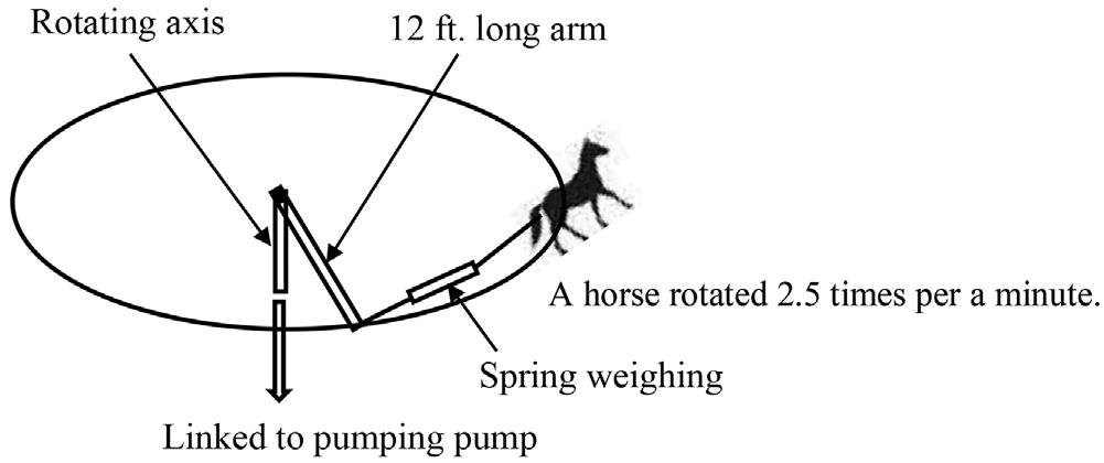 Hetriedtoshowthathissteamenginewasefficientandexcellent.Inhisdays, waterwaspumpedupfromacoalminebyusingahorse.Thehorsewasconnected toanedgeofa12ft.longarm.Anotheredgeofthearmwasfixedattherotating axisthatwaslinkedtoapumpatacoalmine.Wattletthehorsewalkaroundthe axisandmeasuredtheforcethatthehorsepulledthearmwithasshownin Fig.1.7
