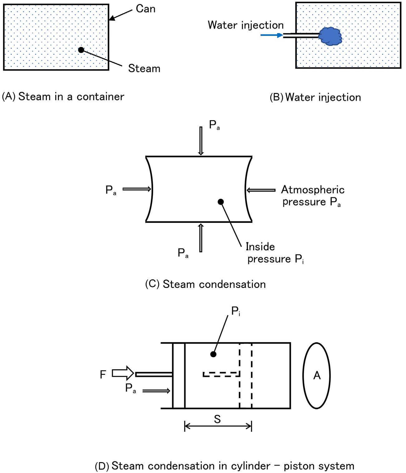 Let’sconsiderthesituationshownin Fig.1.5.Steamproducedbyburningfirewood orcoalisfilledinacansuchasA.Then,waterisinjectedinthecanasB,resultingin steamcondensation.Thepressure Pi inthecanbecomesconsiderablylowerthanthe atmosphericpressure Pa asshowninC.Thus,forceresultingfromthepressuredifferencebetween Pa and Pi actsonthesurfaceofthecanandthecanmaybecrushedin somecase.Now,supposethatthisseriesofsteamcondensationinacontainerisperformedinacylinder-pistonsystemasin D.Whenthesteaminthecylinderiscondensedandthepressureinthecylinderbecomes Pi,thepistonispushedwiththeforce.
