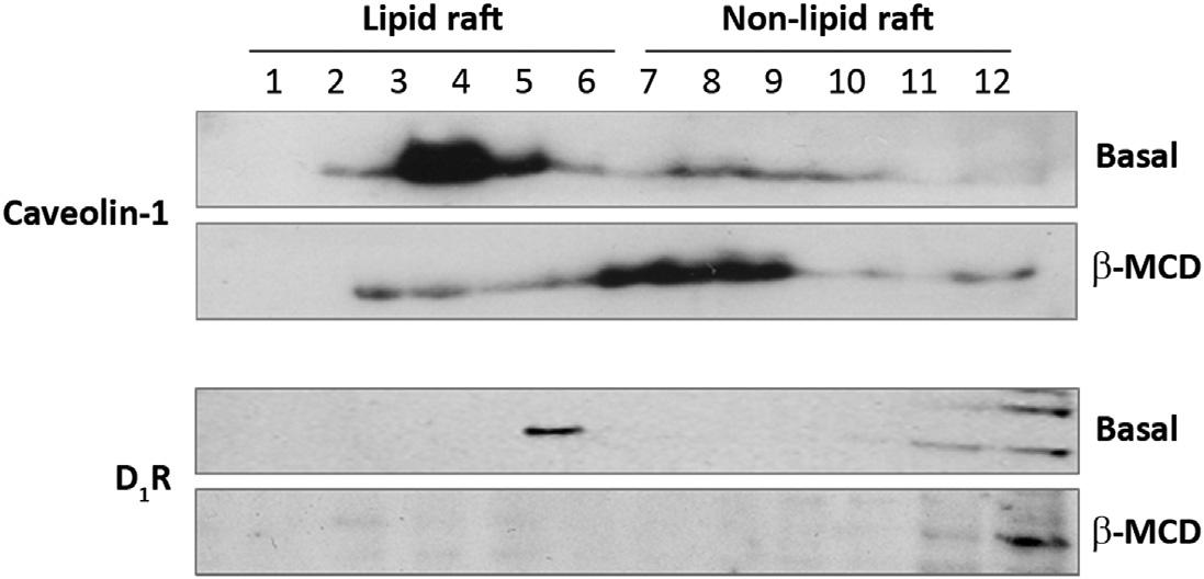 Lipidraftandnon-lipidraftfractionsfromhumanrenalproximaltubulecellstreatedwith b-MCD,acholesterol-depletingandlipidraft-disruptingagent,werepreparedbydetergentfreemethodandsucrosegradientultracentrifugation.Thedistributionofcaveolin-1,alipid raftmarker,andthedopamineD1 receptor(D1R),aGPCR,isshownintheimmunoblots. ImagesarecourtesyofPeiyingYu,MD.