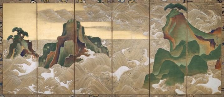 I-13 Ogata Korin, Waves at Matsushima, Edo period, Japan, ca. 1700–1716. Six-panel folding screen, ink, colors, and gold leaf on paper, 4′ 11