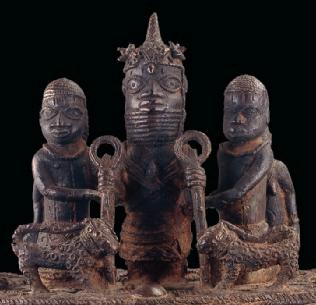 In other cases, artists have used disproportion to focus attention on one body part (often the head) or to single out a group member (usually the leader). These intentional “unnatural” discrepancies in proportion constitute what art historians call hierarchy of scale, the enlarging of elements considered the most important. On the bronze altar from Nigeria illustrated here (fig. I-1), the sculptor varied the size of each figure according to the person’s social status. Largest, and therefore most important, is the Benin king, depicted twice, each time flanked by two smaller attendant figures and shown wearing a multistrand coral necklace emblematic of his high office. The king’s head is also disproportionately large compared to his body, consistent with one of the Benin ruler’s praise names: Great Head.