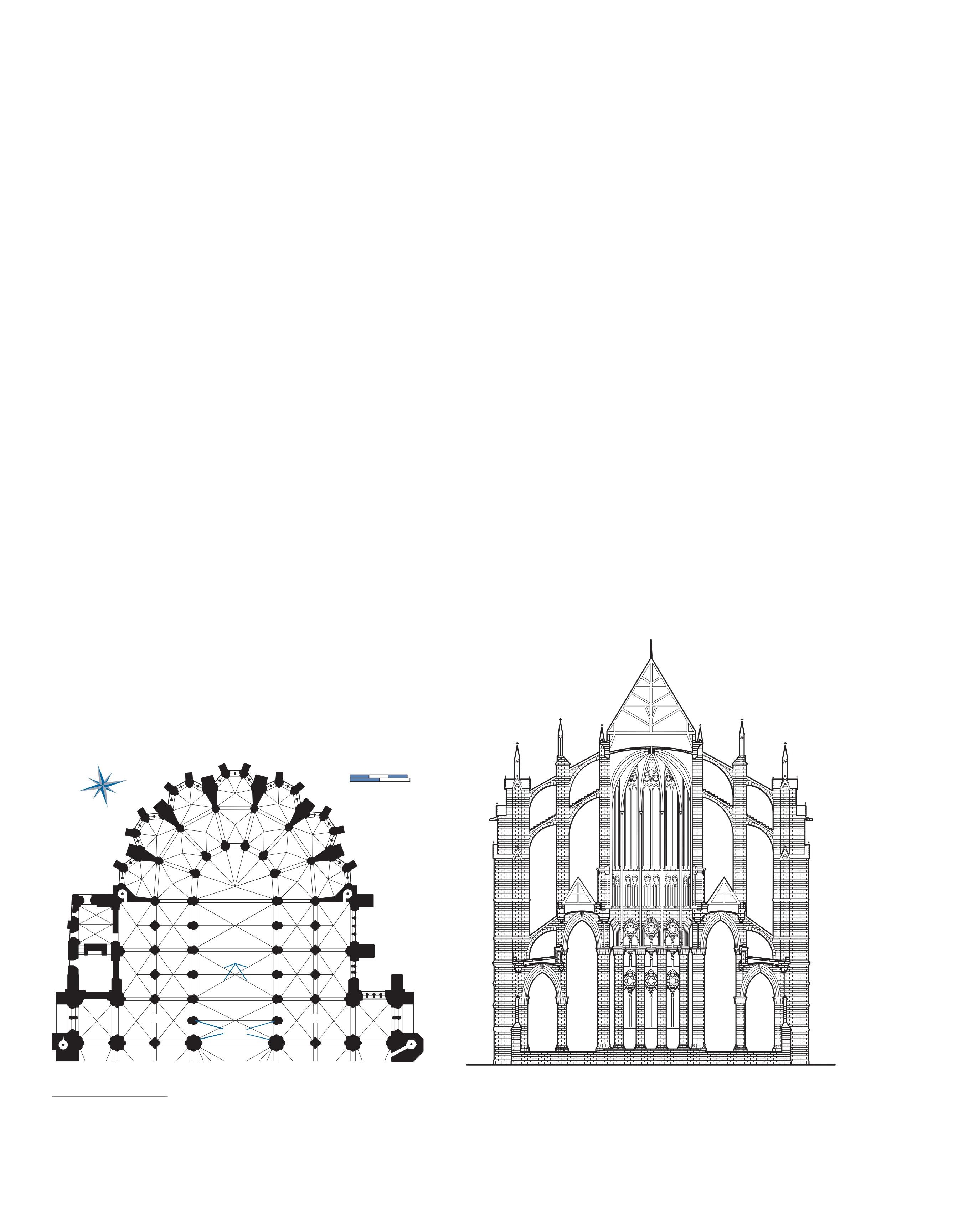 choir’s shape and the location of the piers dividing the aisles and supporting the vaults above, as well as the pattern of the crisscrossing vault ribs. The lateral section shows not only the interior of the choir with its vaults and tall stained-glass windows but also the structure of the roof and the form of the exterior flying buttresses holding the vaults in place.