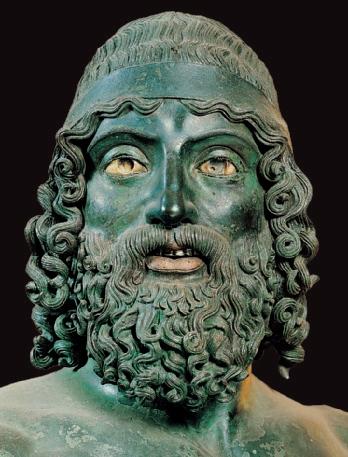 Head of a warrior, detail of a statue (fig. 5-36) from the sea off Riace, Italy, ca. 460–450 bce. Bronze, full statue 6′ 6″ high. Museo Archeologico Nazionale, Reggio Calabria.