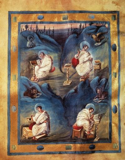Artists depict figures with attributes in order to identify them for viewers. The authors of the four Gospels have distinctive attributes—winged man (Matthew), eagle (John), lion (Mark), and ox (Luke).