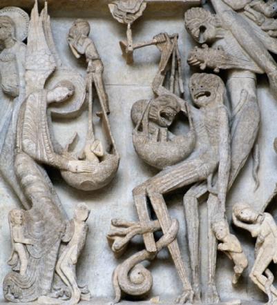 students face is to perceive and adjust to these differences. In fact, many artists have used disproportion and distortion deliberately for expressive effect. In the medieval French depiction of the weighing of souls on Judgment Day (fig. I-7), the devilish figure yanking down on the scale has distorted facial features and stretched, lined limbs with animal-like paws for feet. Disproportion and distortion make him appear “inhuman,” precisely as the sculptor intended.