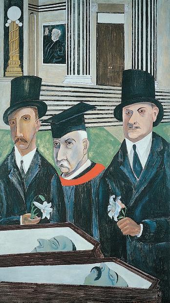 In The Passion of Sacco and Vanzetti (fig. I-6), for example, the two coffins, the trio headed by an academic, and the robed judge in the background are all pictorial clues revealing the painting’s subject. The work’s date must be after the trial and execution (the terminus post quem), probably while the event was still newsworthy. And because the two men’s deaths caused the greatest outrage in the United States, the painter–social critic was probably an American.