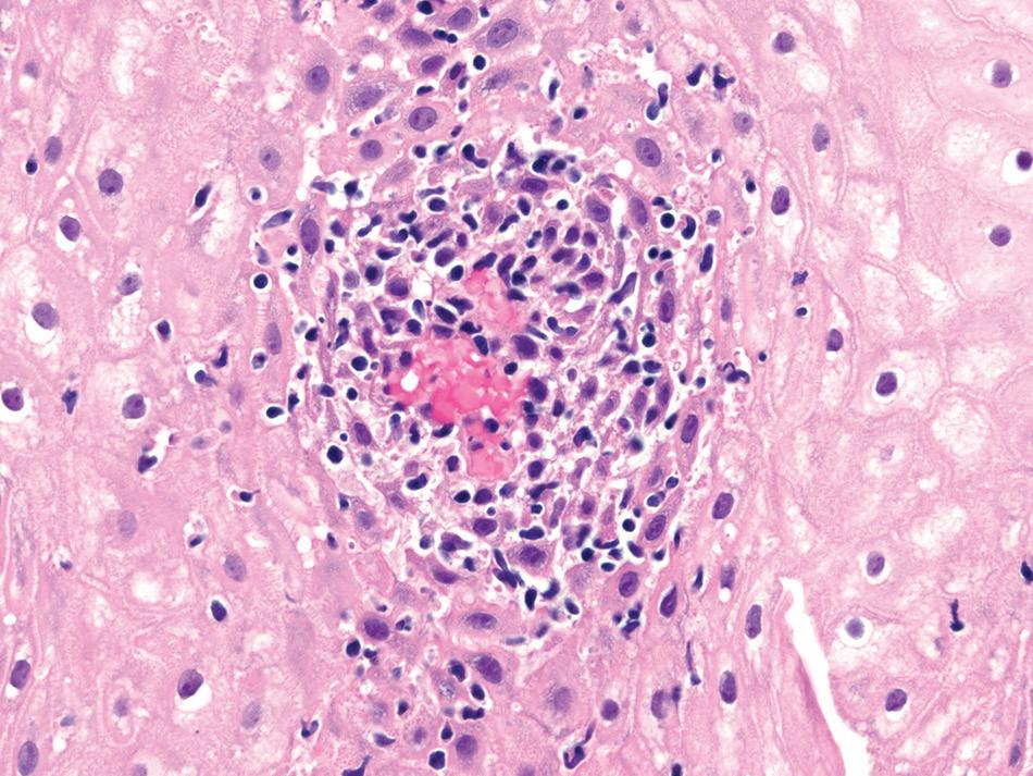 Well-formed, non-necrotizing epithelioid granulomas may also be present. Active inflammation consisting of intraepithelial neutrophils, erosion, or ulceration can be seen.