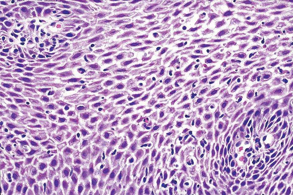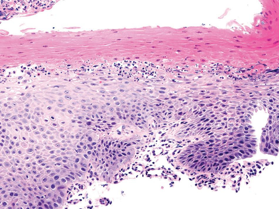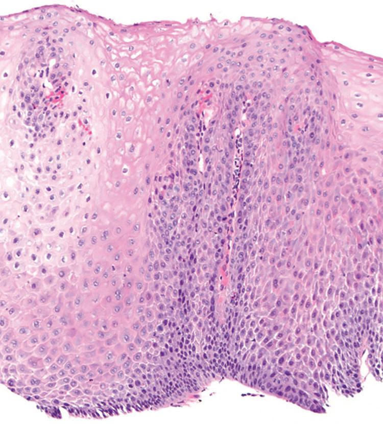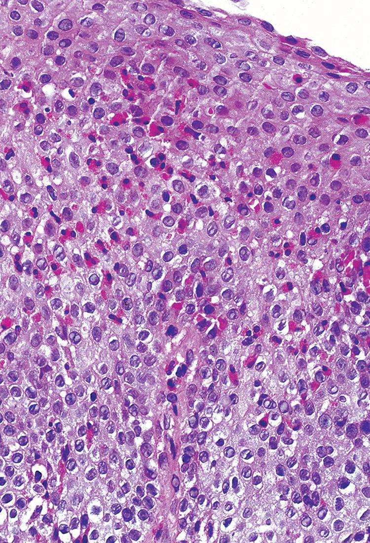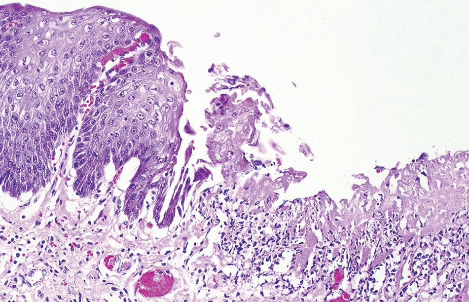 The most striking feature is a two-toned appearance of the squamous mucosa at low power, with the superficial necrotic aspect being markedly eosinophilic compared with the viable basal aspect (Fig. 1.17). A distinct demarcation between the two layers is present, and neutrophils and apoptotic debris may be present along this line of demarcation. In some cases, the superficial layer shows parakeratosis and sloughing of the necrotic squamous epithelium.