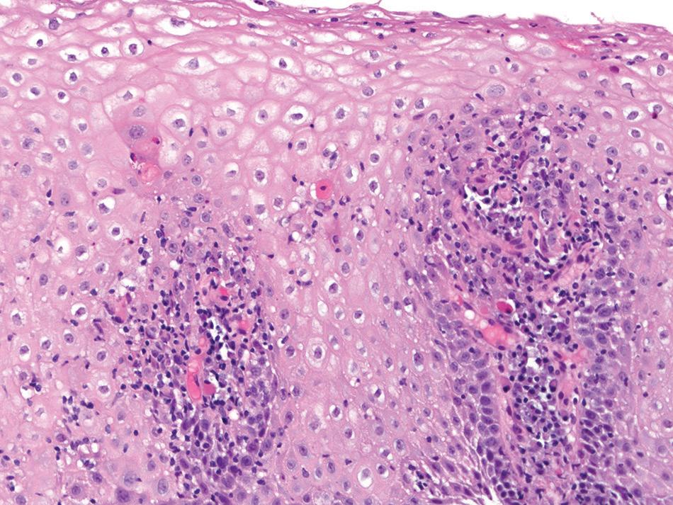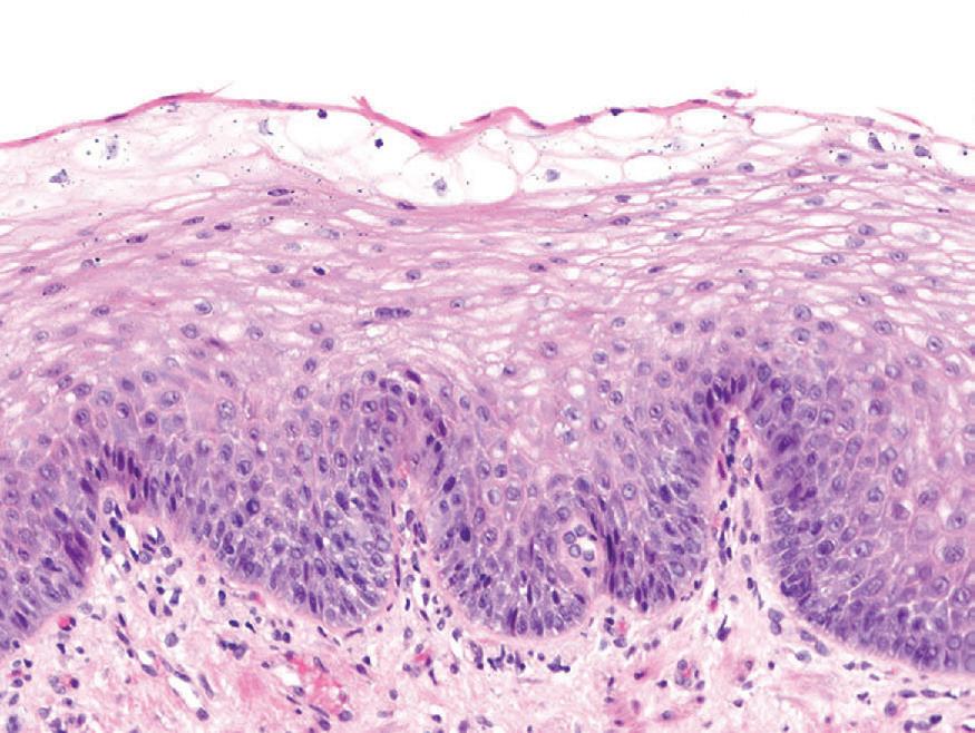 ■ Prominent eosinophilia, spongiosis, and necrosis of the squamous epithelium