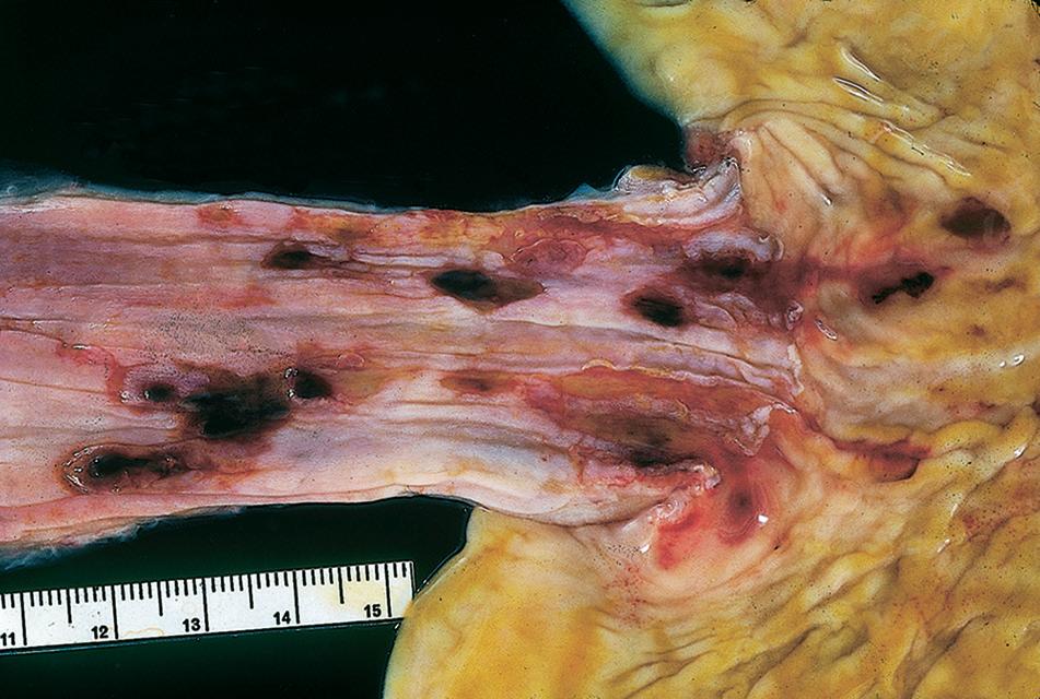 ■ symptoms include upper gastrointestinal tract bleeding, dysphagia, nausea, and vomiting