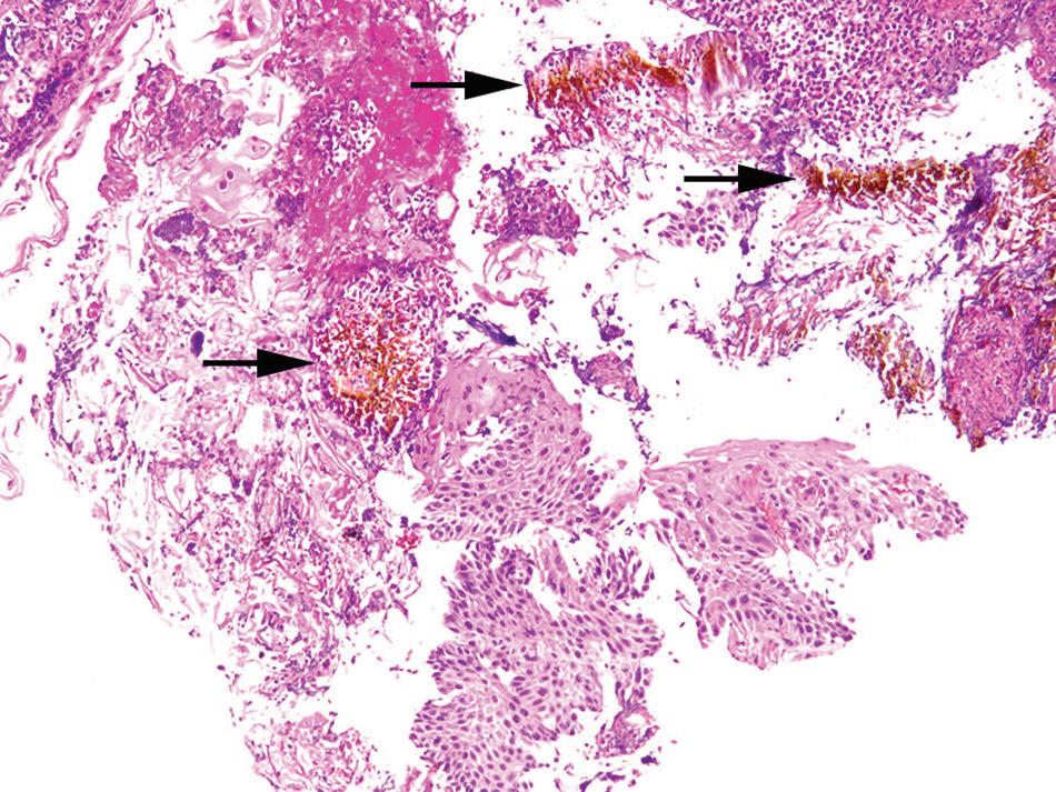 Pill esophagitis. refractile brown iron pill material (arrows) is present among inflamed squamous epithelium.