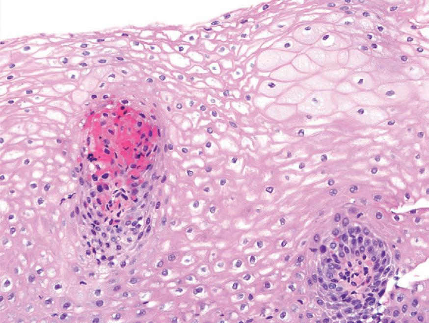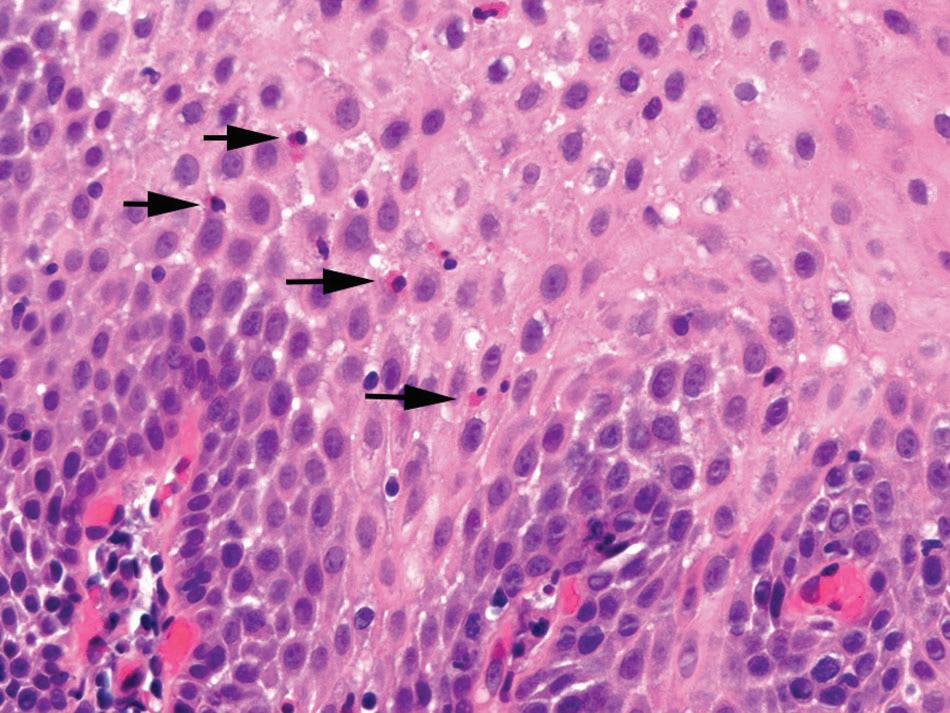 ■ severe gastroesophageal reflux disease and eosinophilic esophagitis have basal cell hyperplasia, spongiosis, and prior typical clinical symptoms