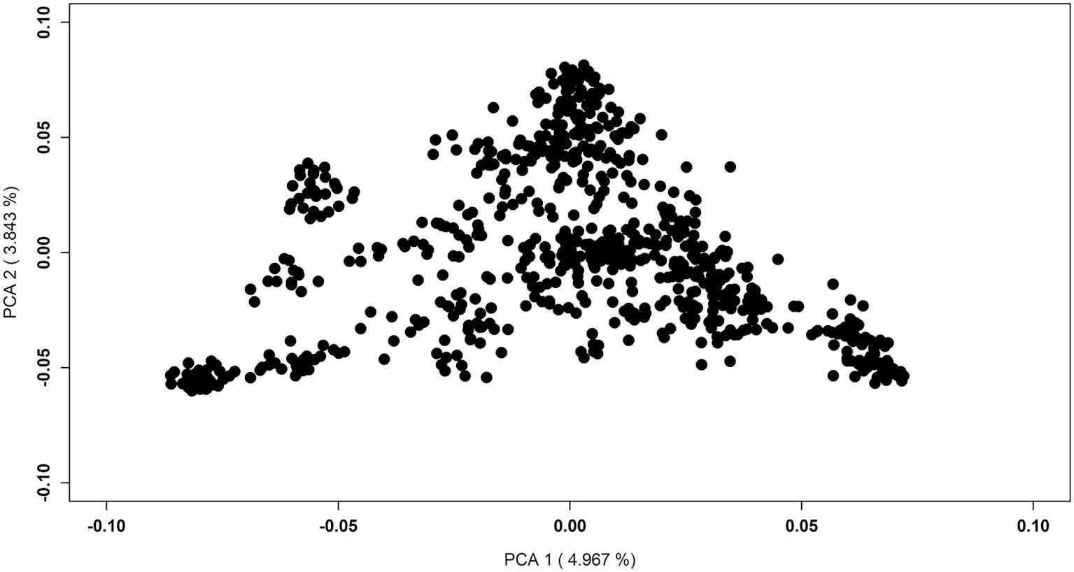 structure and get an idea on number of clusters possibly representing full and/or half-sib families. The PCA based cluster analysis showed that the population is quite homogenous (little to no cluster differentiation), with relatively low variation explained by first two PCAs, 4.9% and 3.8% variation explained by PCA1 and PCA2, respectively (Fig. 1). The cluster analysis showed ~42 clusters with number of individuals ranging from 2 to 53 individuals per cluster with a mean cluster size of 23 individuals.