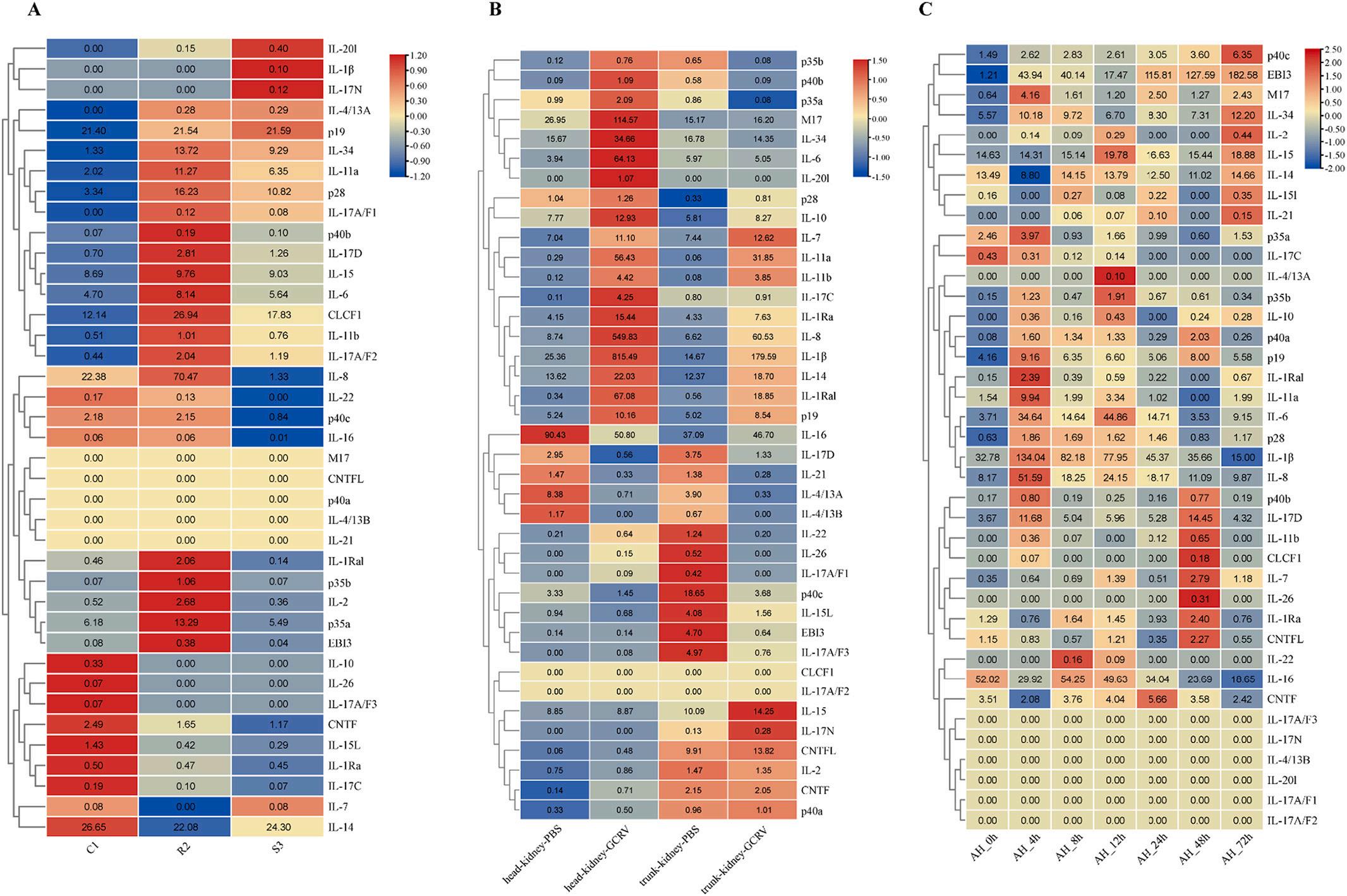 To explore the tissue distribution of grass carp IL genes in eleven healthy tissues (brain, muscle, liver, intestine, blood, head-kidney, kidney, skin, gill, spleen, and heart) (Xu et al., 2019), the RNA-Seq datasets (Accession No. PRJNA510861) were downloaded from the NCBI Sequence Read Archive (SRA) (https://www.ncbi.nlm.nih. gov/sra/). To explore the expression patterns of grass carp IL genes in different tissues (gill, intestine, hepatopancreas, and spleen) (Shi et al., 2014) post GCRV challenge or cells (pre-sorting CIK cells: C1, resistant (to GCRV challenge) pool: R2, and susceptible (to GCRV challenge) pool: S3) (Shang et al., 2017), the RNA-Seq datasets (Accession No. PRJNA229923 and Accession No. PRJNA344676) were downloaded from the SRA. Furthermore, to analyze the expression profiles of grass carp IL genes in spleen post A. hydrophila challenge (Dang et al., 2016), the RNA-Seq datasets (Accession No. PRJNA288831) were downloaded from the SRA.