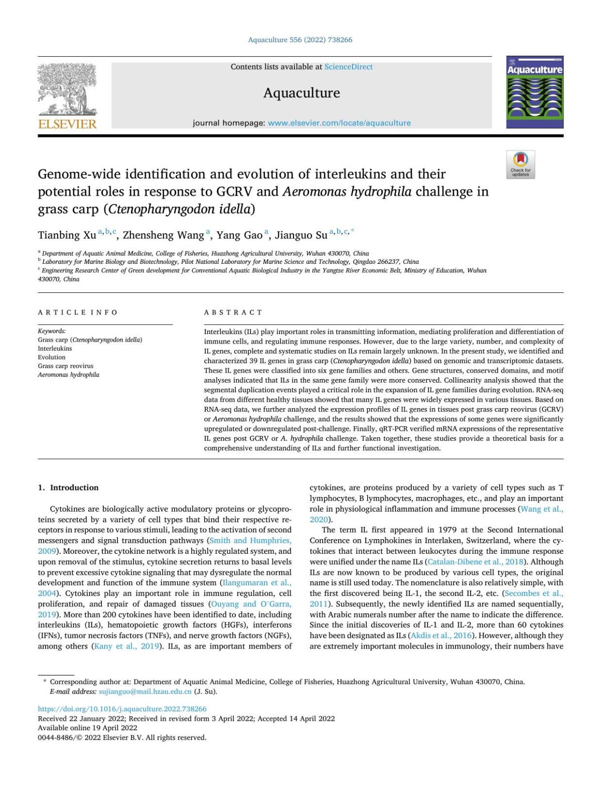 Xu, T.B., Su, J.G., 2021. Genome-wide identification, evolution, and transcriptome-based expression profiling analysis of suppressors of cytokine signaling (SOCS) in grass carp (Ctenopharyngodon idella). Aquaculture. 536, 736484