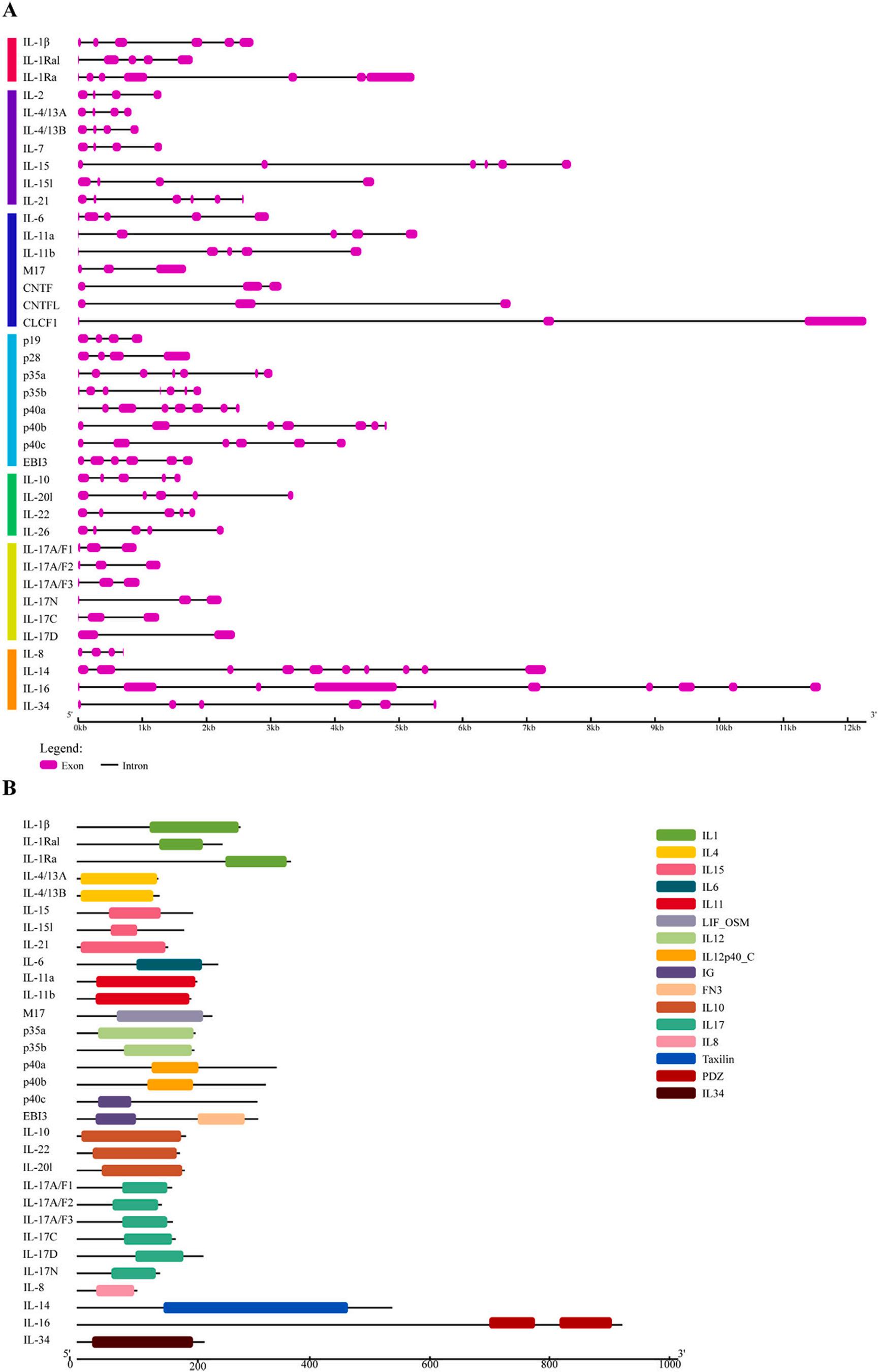 In this study, a total of 39 IL genes were identified in grass carp and their designations were showed Table 1 As shown in Table 1, there were some IL genes in grass carp that were not present in human, such as IL1Ral, IL-15l, IL-11b, CNTFL, and p35b, etc. Of course, there were also some IL genes present in human that were not present in grass carp. The amino acid residue length of IL proteins in grass carp ranged from 98 (IL8) to 907 (IL-16); the pI ranged from 5.02 (IL-1Ra) to 10.42 (p28), and the MW ranged from 10,952.09 (IL-8) to 97,942.04 (IL-16) Da. In addition, we performed subcellular localization predictions for these ILs, which showed that most IL proteins were localized extracellularly, with only a small fraction located in the nucleus (IL-1β, CNTF, and CNTFL) and cytoplasm (IL-1Ra, IL-1Ral, IL-14, and IL-16). Signal peptide prediction analysis showed that most of the ILs had signal peptides; transmembrane helix prediction analysis showed that none of the IL members had transmembrane helices except IL-15l, which had a transmembrane helix. The details were shown in Table S1.