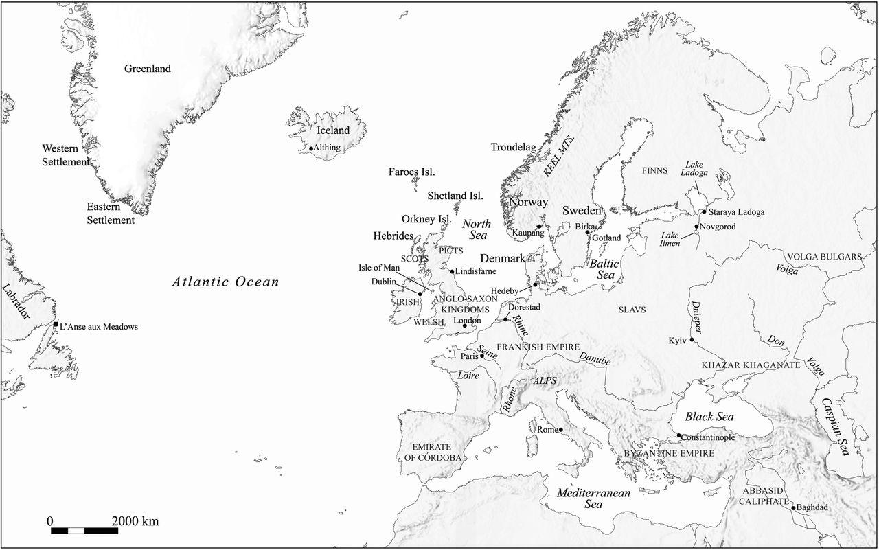 For personal names from the ancient sources, I anglicize unfamiliar letters and drop accents for ease of reading, while often giving the original in parenthesis at the first mention of a name. Þ/þ is replaced with th, while Ð/ð is anglicized as d, such that the female names Þorgerður and Þórdís are written as Thorgerdur and Thordis. I also drop the final consonants of many male names, which are actually only the nominative case ending, as in for example the double n in Óðinn, and more commonly the final -r, as in Knútr. Names of modern scholars are retained in their native Scandinavian forms for bibliographical accuracy. Viking Age people were often given nicknames based on appearances, characteristics, and accomplishments. I retain these nicknames, such as Harald Bluetooth and Eirik Bloodaxe, to help distinguish the many Haralds and Eiriks of the period.