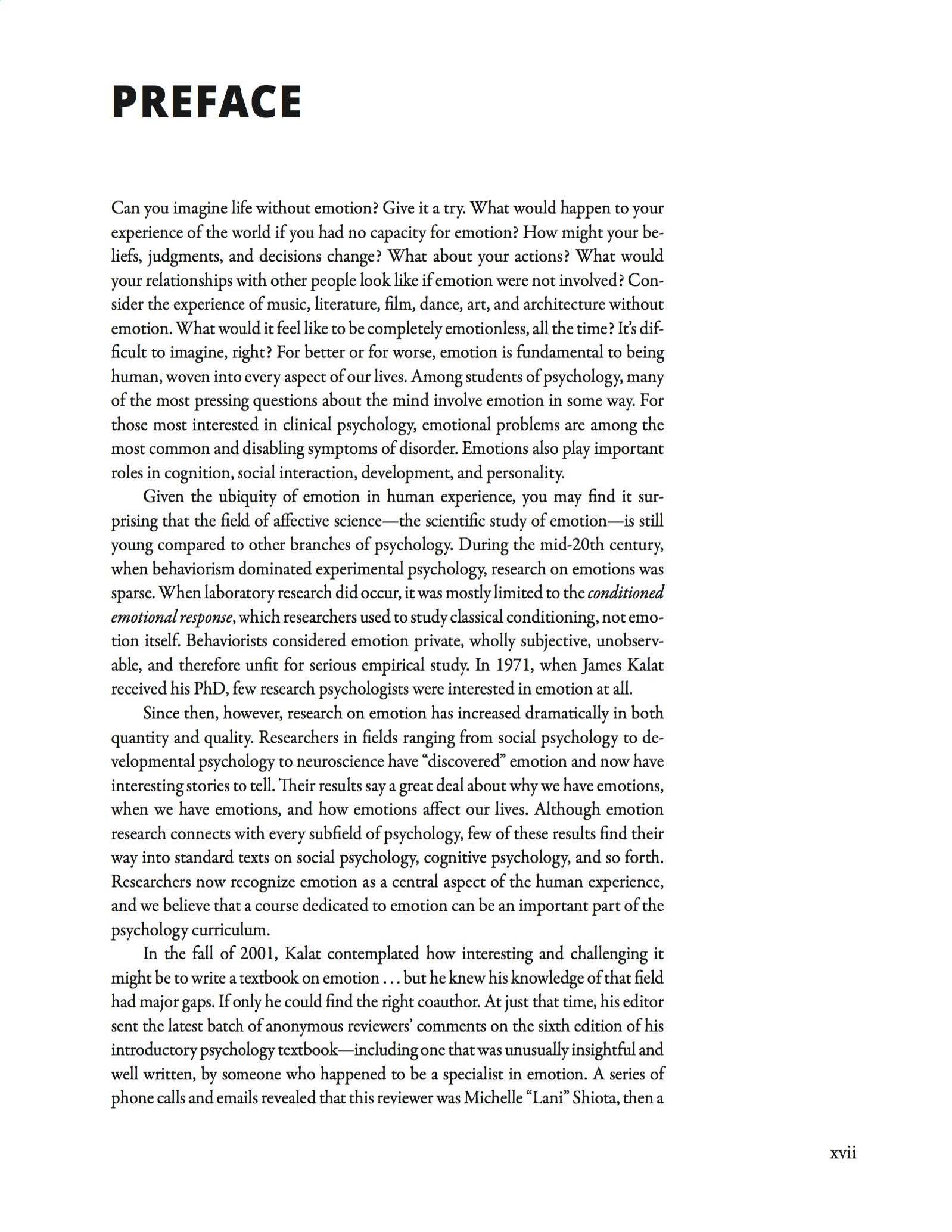 In the fall of 2001, Kalat contemplated how interesting and challenging it might be to write a textbook on emotion ... but he knew his knowledge ofthat field had major gaps. If only he could find the right coauthor. At just that time, his editor sent the latest batch of anonymous reviewers' comments on the sixth edition of his introductory psychology textbook-including one that was unusually insightful and well written, by someone who happened to be a specialist in emotion. A series of phone calls and emails revealed that this reviewer was Michelle "Lani" Shiota, then a