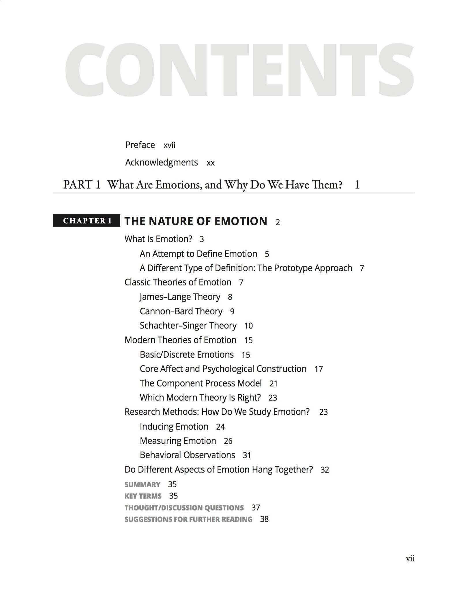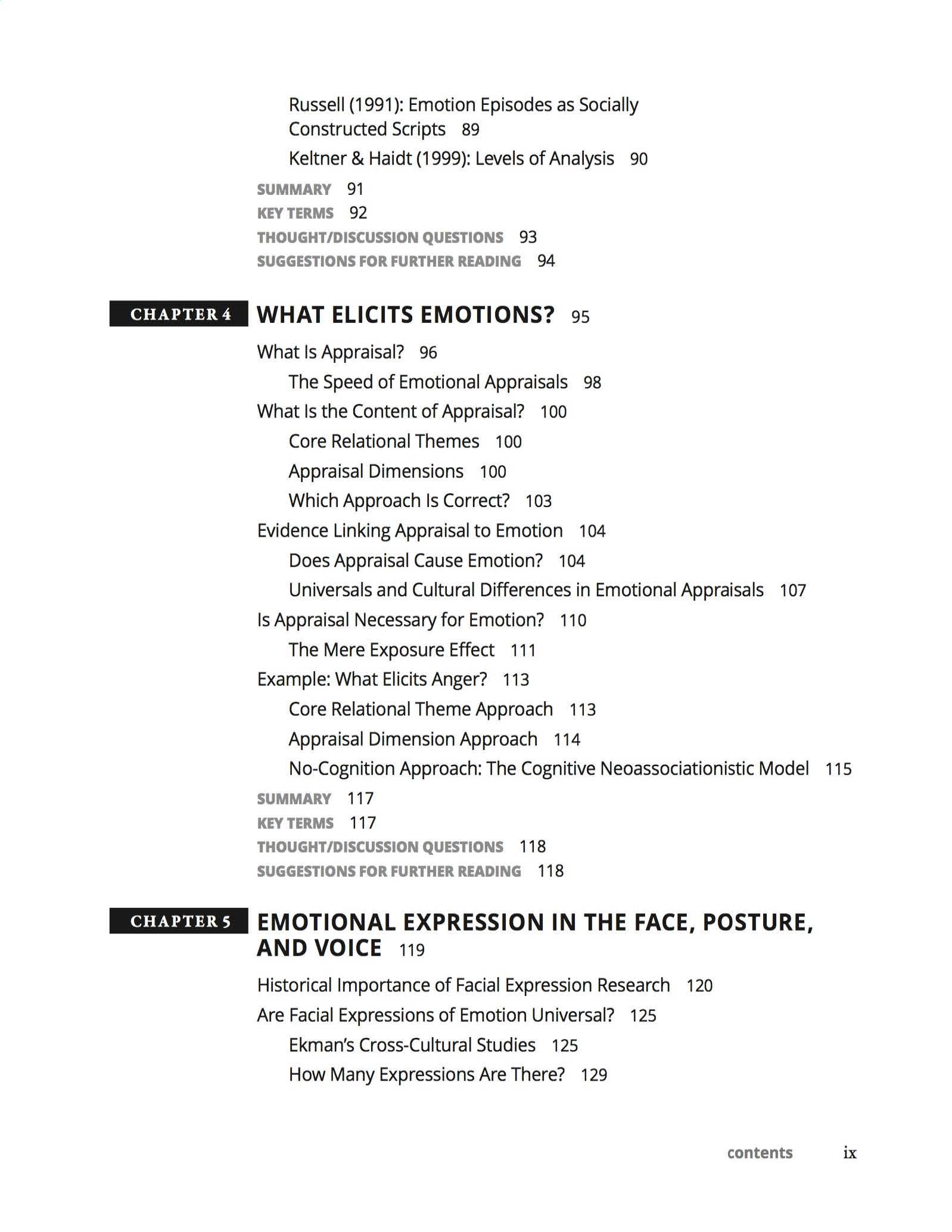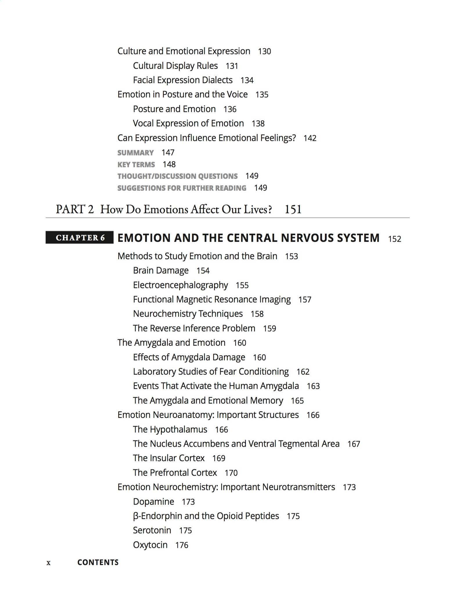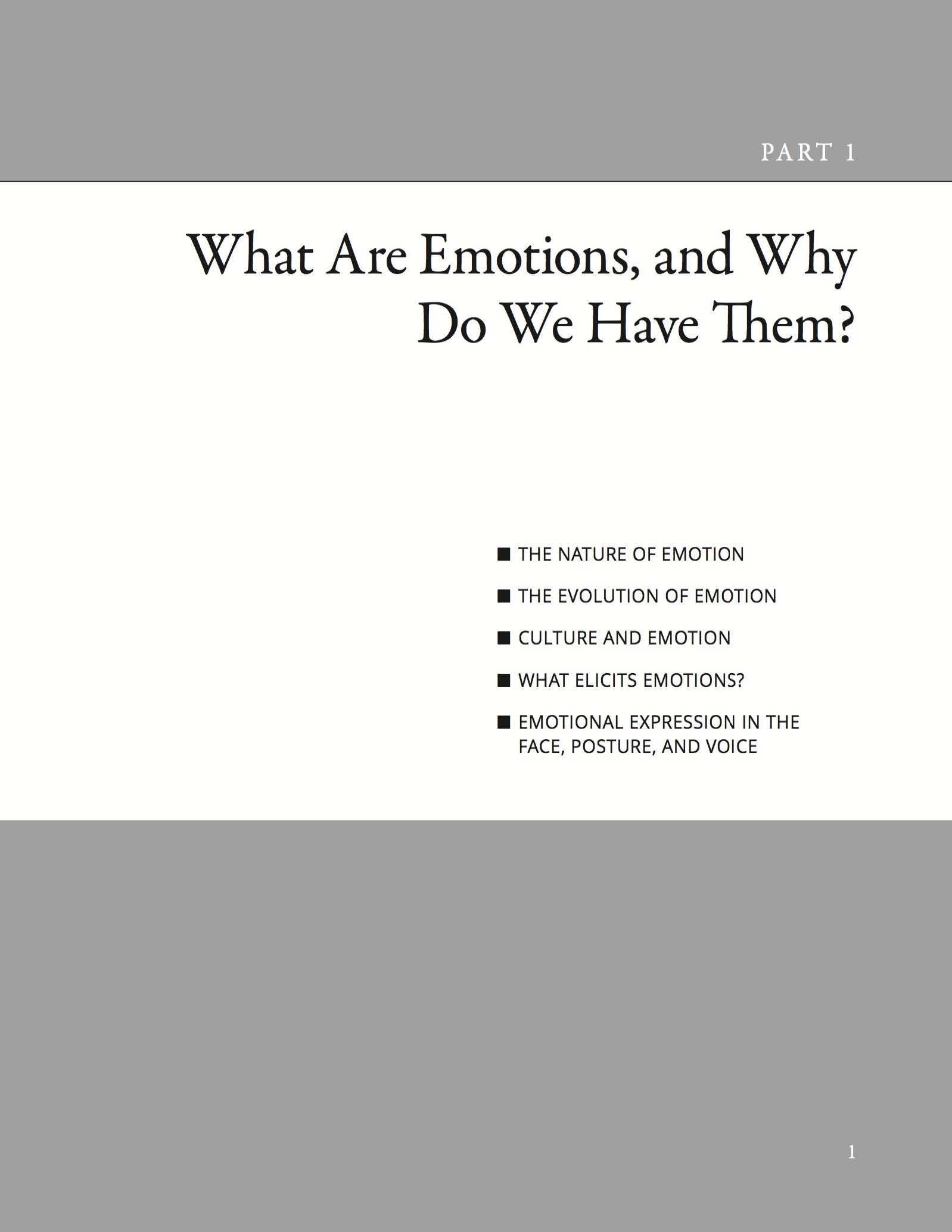 Our goal in preparing this textbook is to provide a comprehensive survey of theory and research on emotion, across the traditional areas of clinical, biological, social, personality, developmental, and cognitive psychology Although the emphasis is largely on theory and research within psychology, we also address relevant content in philosophy, anthropology, and sociology, among other disciplines Students should come away from the textbook with a broad understanding of major issues in the field of affective science. We aimed this text at undergraduate students who have had an introductory psychology course and who remember the essentials about research design, classical conditioning, what a neuron is, and so forth. However, we assume no additional background, and we believe the text should be suitable for a course that enrolls undergraduate sophomores, juniors, seniors, and even students in terminal master's programs.