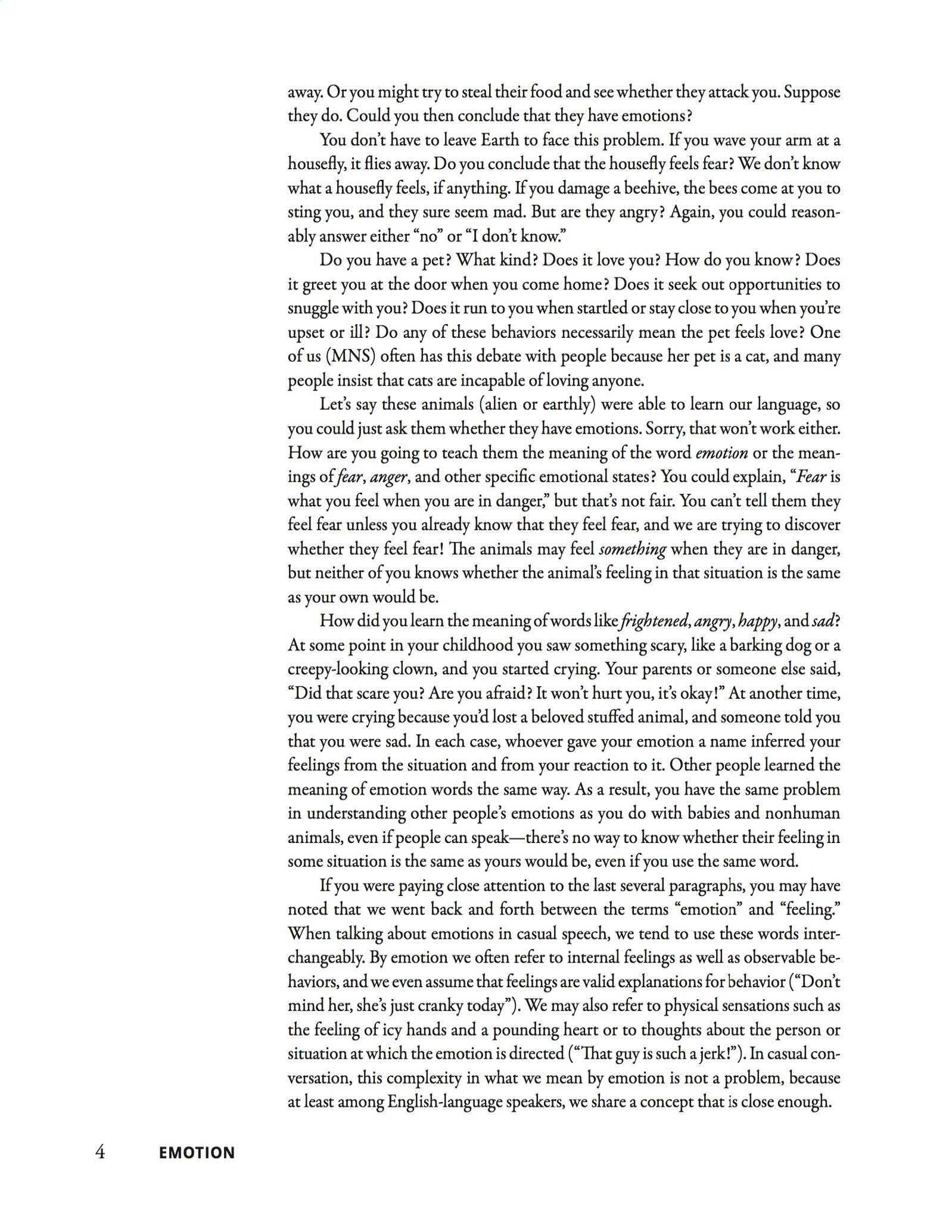 Let's say these animals (alien or earthly) were able to learn our language, so you could just ask them whether they have emotions. Sorry, that won't work either. How are you going to teach them the meaning of the word emotion or the meanings offear, anger, and other specific emotional states? You could explain, "Fear is what you feel when you are in danger," but that's not fair. You can't tell them they feel fear unless you already know that they feel fear, and we are trying to discover whether they feel fear! The animals may feel something when they are in danger, but neither ofyou knows whether the animal's feeling in that situation is the same as your own would be.