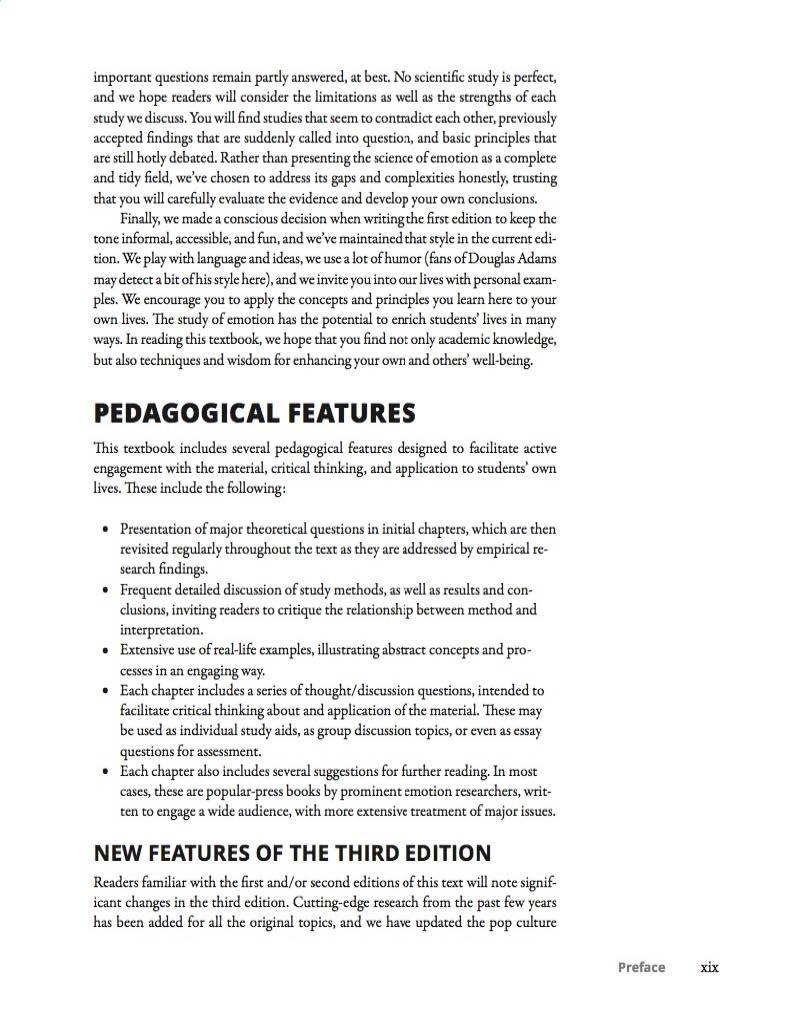 important questions remain partly answered, at be!.lt. No scientific study is perfec t, and we hope readers will co nsider the limitations as well as the strengths of each study we dis cuss . You will find studies that stem to conandict each other, previously accepted findings that are suddenly called into question, and basic principles that are still ho tly debated. Rather than presenting the science of emotio n as a comple te and tidy field, we've chosen to address its gaps and comp lexities ho nes tly, trusting that you will carefully evaluate the evidence and develop your own concl usio ns. Finally, we made a conscious decision when writing the first edi tion to kl:ep the t one informal, accessi ble, and fun , and we've maintained that style in the current edition. We play with language and ideas, we use a lot ofhumor (fans ofDouglas Adams maydetecta bit ofhis style here}, and we invite you into our lives with personal examples . We encourage you to apply the concepts and principles you learn here to your own lives. The study of emotion has the po tential to enrich students' lives in many ways. In reading this textbook, we hope that you find not only academic knowledge, but also techniques and wisdom for enhancing your own and others' well-being.