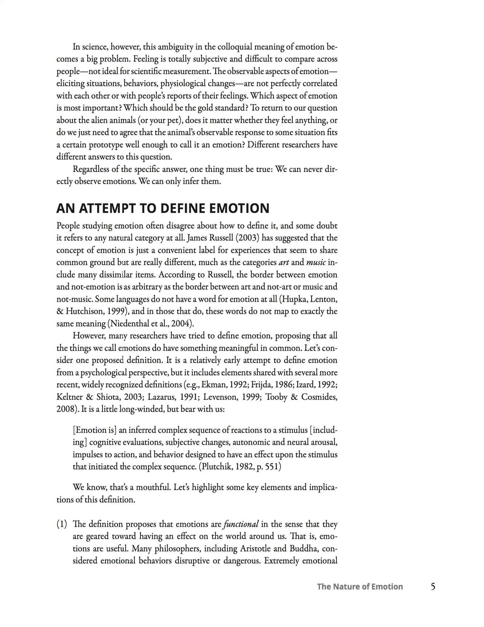 In science, however, this ambiguity in the colloquial meaning of emotion becomes a big problem. Feeling is totally subjective and difficult to compare across people-not ideal for scientific measurement. The observable aspects ofemotioneliciting situations, behaviors, physiological changes-are not perfectly correlated with each other or with people's reports of their feelings. Which aspect ofemotion is most important? Which should be the gold standard? To return to our question about the alien animals (or your pet), does it matter whether they feel anything, or do we just need to agree that the animal's observable response to some situation fits a certain prototype well enough to call it an emotion? Different researchers have different answers to this question.