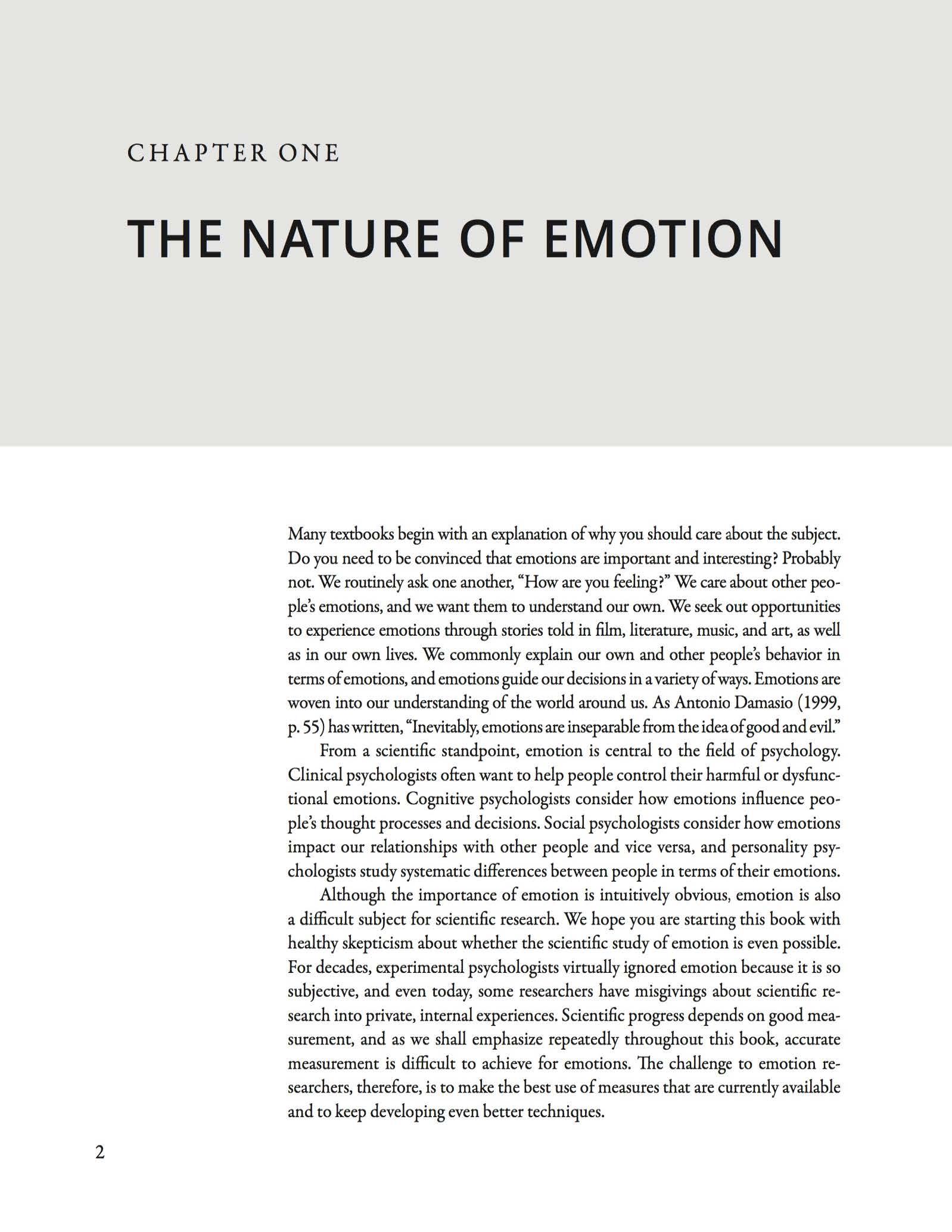 Many textbooks begin with an explanation of why you should care about the subject. Do you need to be convinced that emotions are important and interesting? Probably not We routinely ask one another, "How are you feeling?" We care about other people's emotions, and we want them to understand our own. We seek out opportunities to experience emotions through stories told in film, literature, music, and art, as well as in our own lives We commonly explain our own and other people's behavior in terms ofemotions, and emotions guide our decisions in a variety of ways. Emotions are woven into our understanding of the world around us. & Antonio Damasio ( 1999, p. 55) has written, "Inevitably, emotions are inseparable from the idea ofgood and evil."
