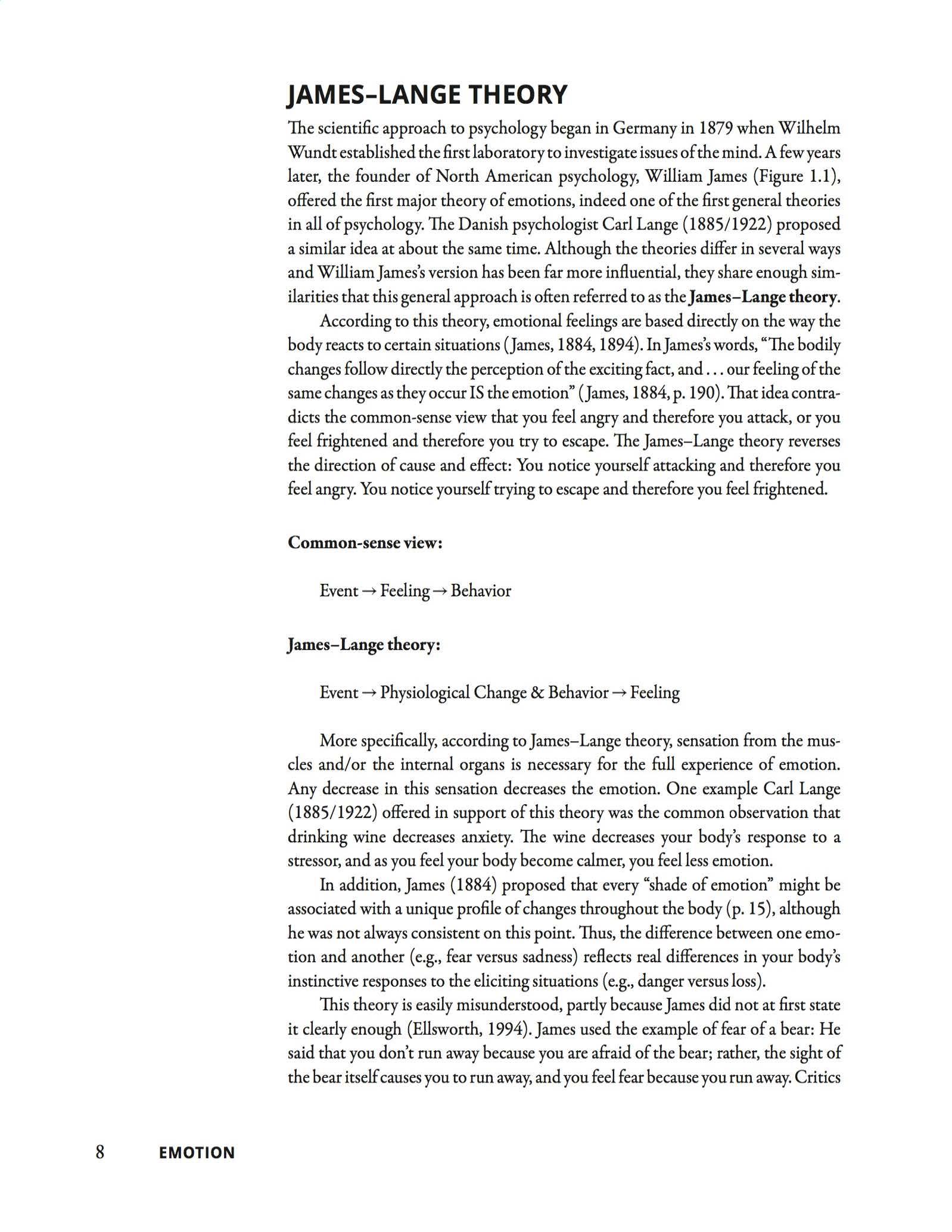 The scientific approach to psychology began in Germany in 1879 when Wilhelm Wundt established the first laboratory to investigate issues ofthe mind. A few years later, the founder of North American psychology, William James (Figure 1.1 ), offered the first major theory of emotions, indeed one of the first general theories in all of psychology. The Danish psychologist Carl Lange (1885/1922) proposed a similar idea at about the same time. Although the theories differ in several ways and William James's version has been far more influential, they share enough similarities that this general approach is often referred to as the James- Lange theory. According to this theory, emotional feelings are based directly on the way the body reacts to certain situations (James, 1884, 1894). In James's words, "The bodily changes follow directly the perception ofthe exciting fact, and ... our feeling of the same changes as they occur IS the emotion" (James, 1884, p. 190). That idea contradicts the common-sense view that you feel angry and therefore you attack, or you feel frightened and therefore you try to escape. The James-Lange theory reverses the direction of cause and effect: You notice yourself attacking and therefore you feel angry. You notice yourself trying to escape and therefore you feel frightened