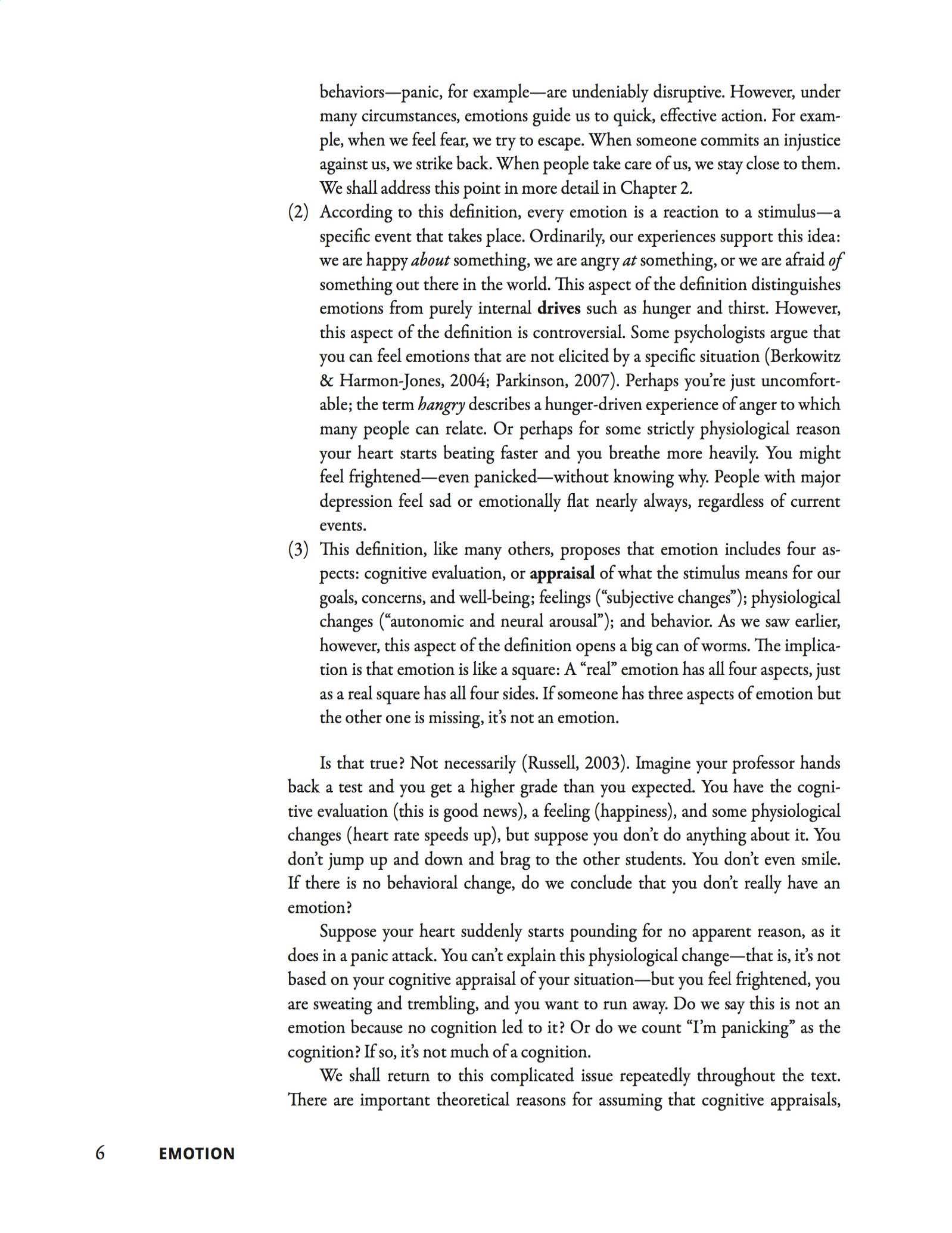 feelings, physiological changes, and behaviors hang together in emotions, as proposed by the definition. We will discuss these reasons in more detail in Chapter 2, and we'll discuss evidence regarding the assumption later in this chapter, as well as in subsequent chapters. However, we'll also challenge this assumption in several places.