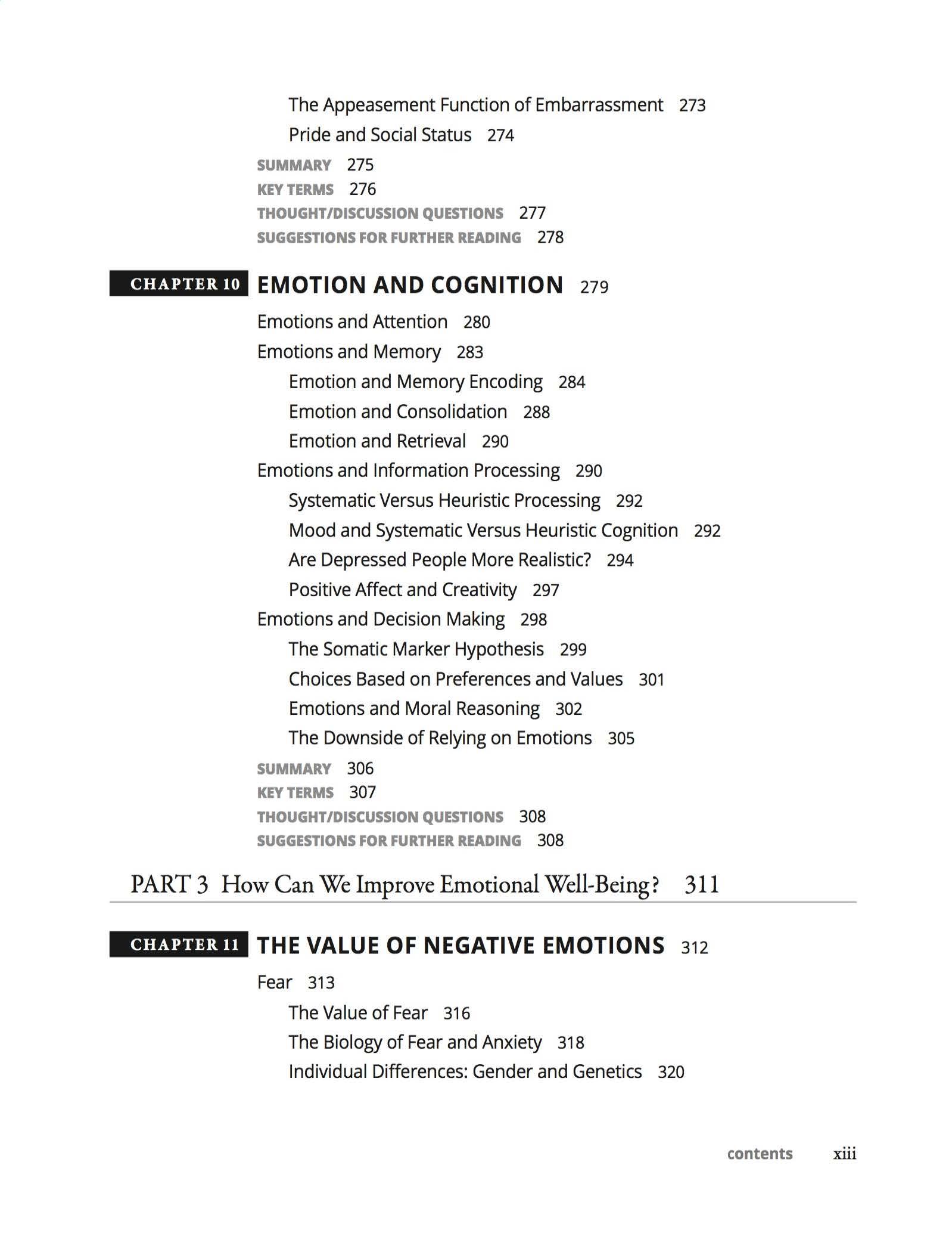 First, whereas the first and second editions were organized into major sections of general issues, individual (specific) emotions, and emotion research in subdisciplines of psychology, the major sections of the third edition reflect the three questions that we find are most important to students: ( 1) What are emotions, and why do we have them?; (2) How do emotions affect our lives?; and (3) How can we improve emotional well-being?