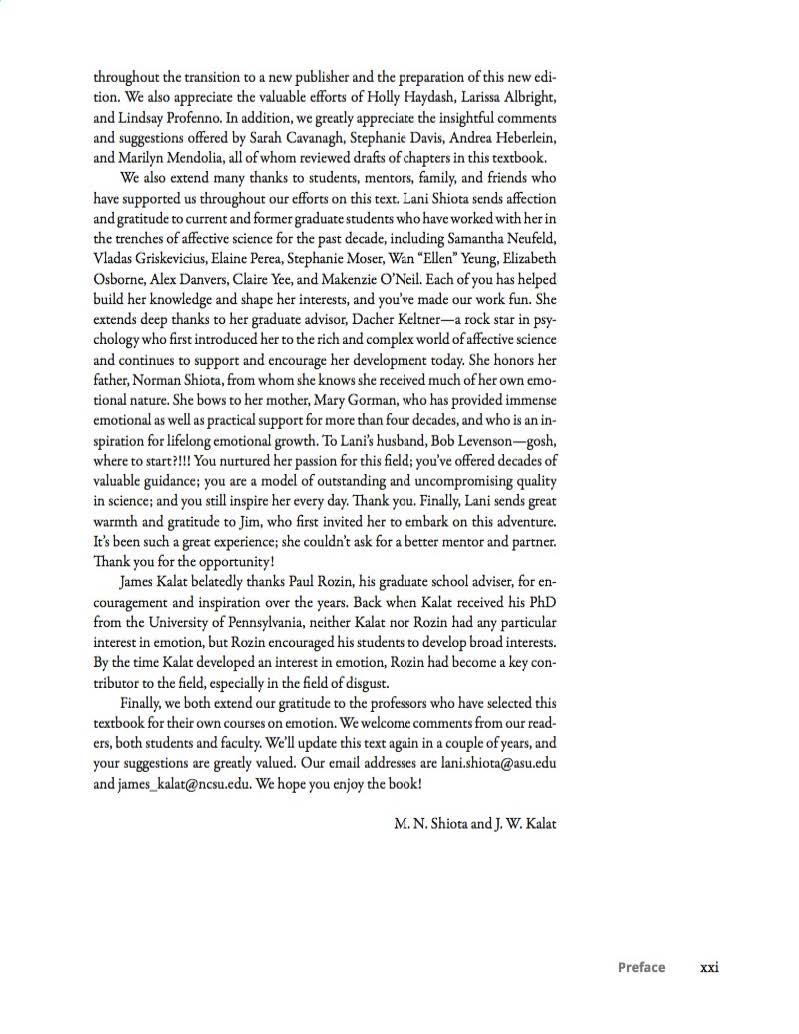 Finally, we both extend our gratitude to the professors who have selected this textbook for their own courses on emotion. We welcome comments from our readers, both students and faculty. We'll update this text again in a couple ofyears, and your suggestions are greatly valued. Our email addresses are lani.shiota@asu.edu and james kalat@ncsu.edu. We hope you enjoy the book!