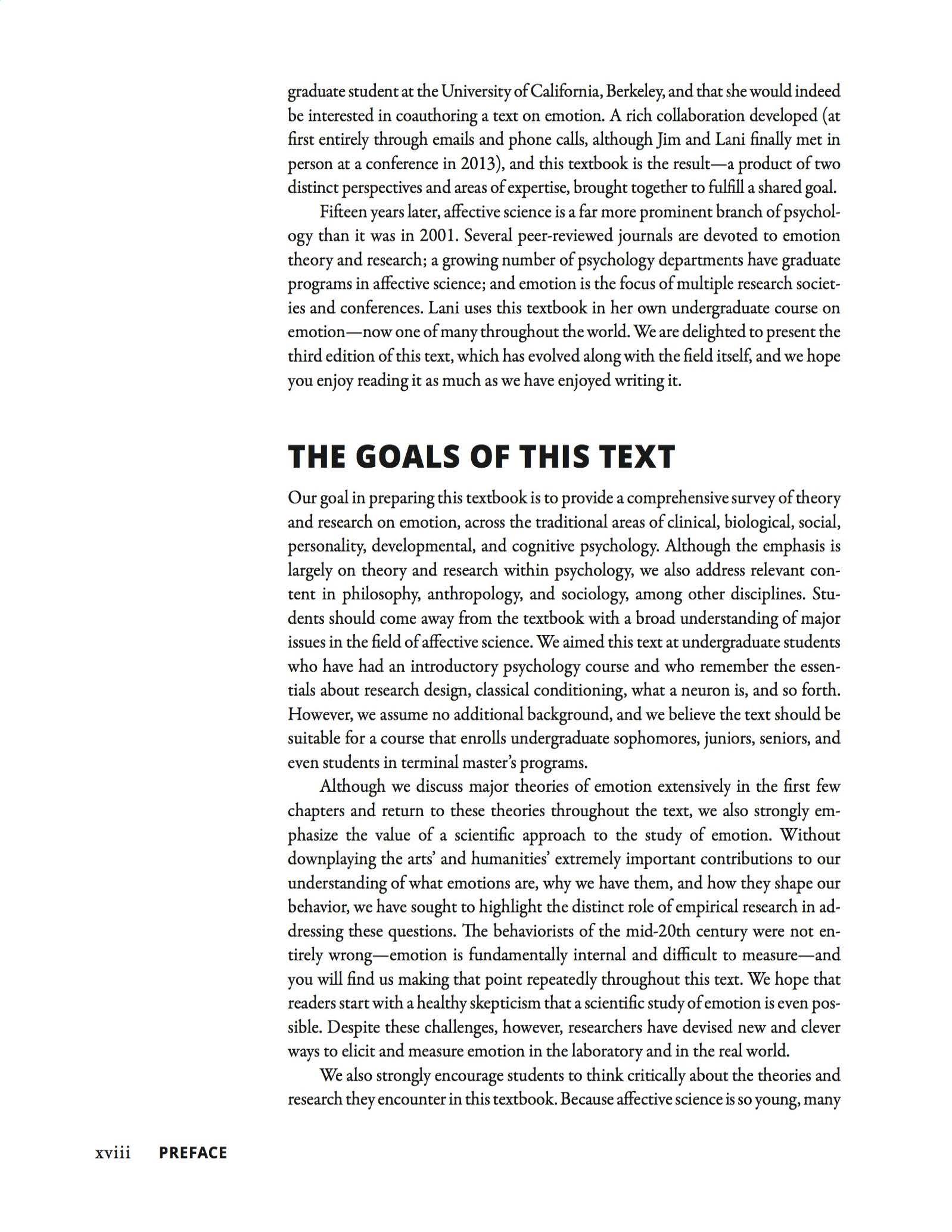 graduate student at the University of California, Berkeley, and that she would indeed be interested in coauthoring a text on emotion. A rich collaboration developed (at first entirely through emails and phone calls, although Jim and Lani finally met in person at a conference in 2013), and this textbook is the result-a product of two distinct perspectives and areas of expertise, brought together to fulfill a shared goal. Fifteen years later, affective science is a far more prominent branch ofpsychology than it was in 2001. Several peer-reviewed journals are devoted to emotion theory and research; a growing number of psychology departments have graduate programs in affective science; and emotion is the focus of multiple research societies and conferences. Lani uses this textbook in her own undergraduate course on emotion-now one ofmany throughout the world. We are delighted to present the third edition of this text, which has evolved along with the field itsel£ and we hope you enjoy reading it as much as we have enjoyed writing it.