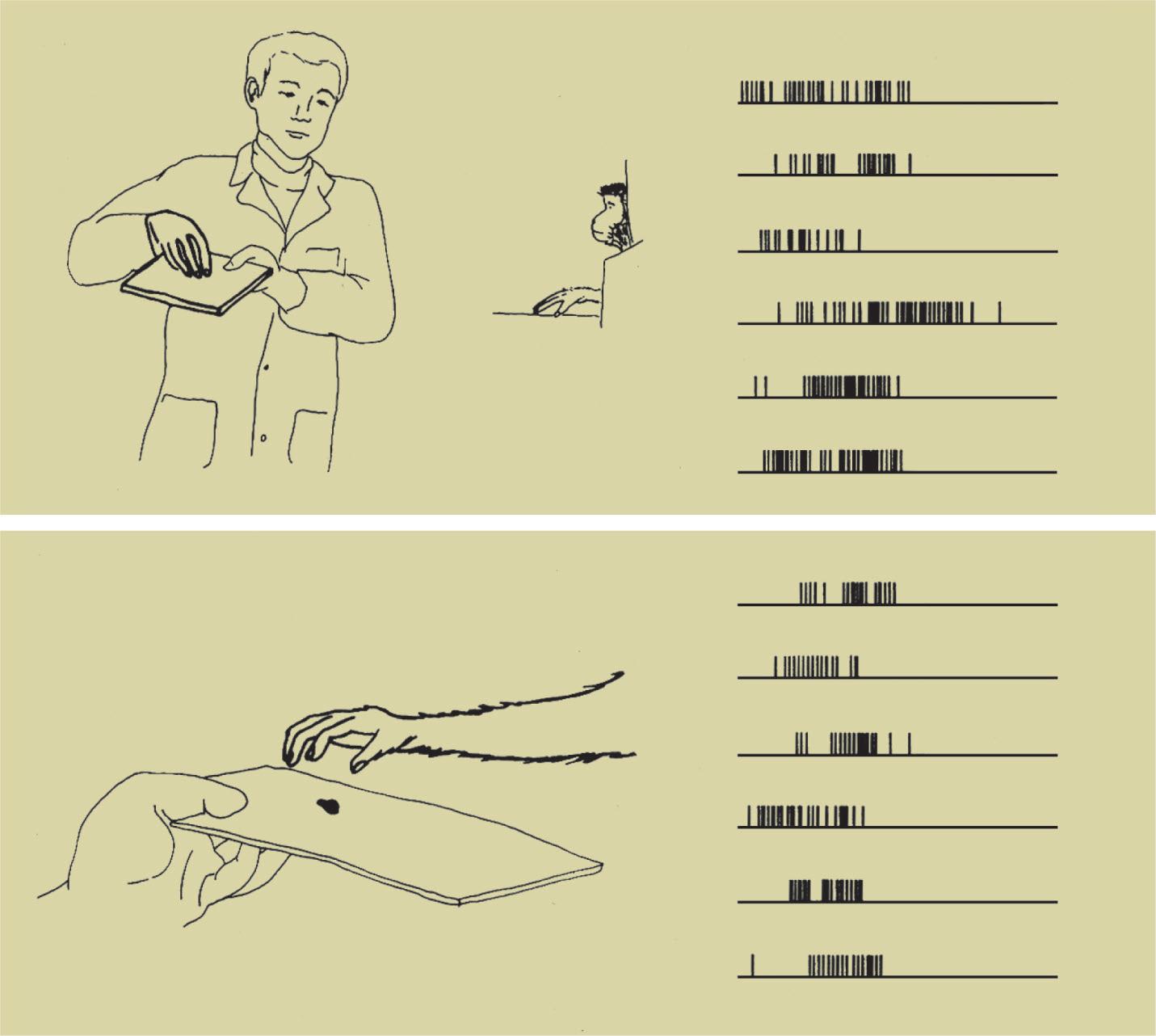 up a piece of food, holding it in their hand, lifting it to their mouth but also cracking a nut or swatting an object away. Sometimes the experimenters would lay out a variety of visual stimuli, pieces of food or objects of different shape, size, and orientation, placing them close to or far from the animal. They would also execute actions in front of the animal that were very similar to those the animal itself was accustomed to performing.