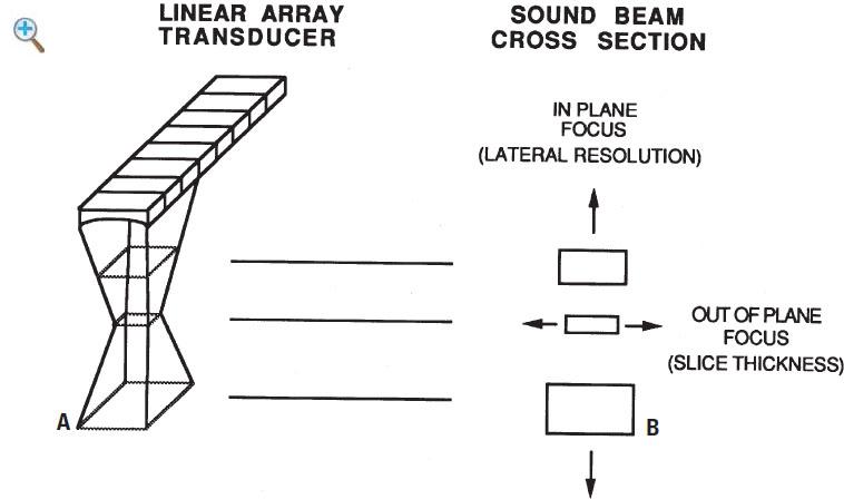 The array transducers described above allow for variable depth and electronically controlled focusing of the sound beam in the plane of the image but not inthe directionperpendicular tothe plane of imaging.The net effect of conventional in-plane focusing is on lateral resolution in the plane of imaging. Focusing the beam in the out-of-plane direction (also called the elevation plane) affects the out-of-plane resolution, which is identical to the slice thickness. With the conventional array transducers, the slice thickness isfixedandcannotbevariedbytheoperator(Fig. 1-5).