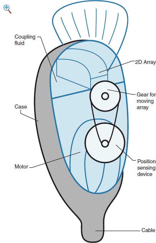 As the name suggests,these are dedicated3Dultrasoundtransducers that are capable of volume acquisition. They are bulky in size and house a 2D array transducer in a casing. The 2D array transducer is surrounded by a coupling gelandisdrivenbyamotorasitsweepsthroughapreselectedvolumeangle. Added to the motor is a magnetic sensing device that coordinates the slices of acquisition with their relative position to each other. This allows an acquisition of volume by maintaining the geometric relationships. Maintaining geometric accuracy is important for spatial orientation and measurements when the information is viewed in multiplanar format or as a volume(Fig.1-7).