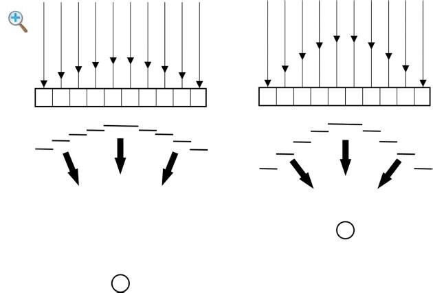 Fig. 1-2 Focusing of array transducers. By slightly delaying the firing of the center elements, the composite pulse is focused in the far field By increasing the delay in firingofthecentralelements,thecompositepulseis focusedinthenearfield.