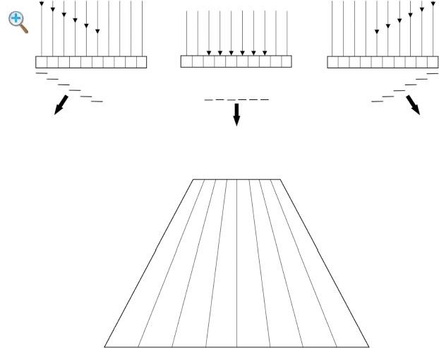 Fig.1-1 Beam steering. By ring the elements on the right side of the array first, a composite pulse is created that is steered to the left By firing all of the elements simultaneously, the composite pulse is steered straight down By firing the left elements first, the pulse is steered to the right. The resulting image has a sector/trapezoidalformat