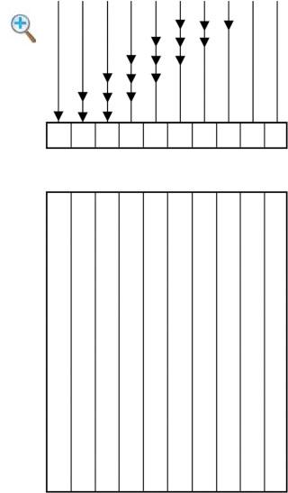 Fig. 1-3 Linear array transducer. In this illustration, there are 10 individual crystal elements Each composite pulse is created by the activation of three adjacent elements The first pulse is created by activation of elements 1 through 3, the second pulse by elements 2 through 4, the third pulse by elements 3 through 5, and soon Theresultingimageformatis rectangular